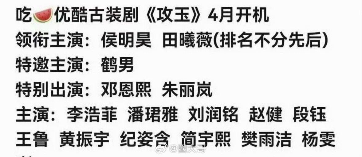 田曦薇侯明昊或将主演攻玉田曦薇和侯明昊居然要一同出演电视剧《攻玉》了啊,之前传出这部剧是鹤男。在侯明昊粉丝拒绝鹤男后,田曦薇来救场了,不过田曦薇还有《我欲乘风》要演,还是蹲一个剧组能早日官宣吧!曝侯明昊攻玉女主是田曦薇