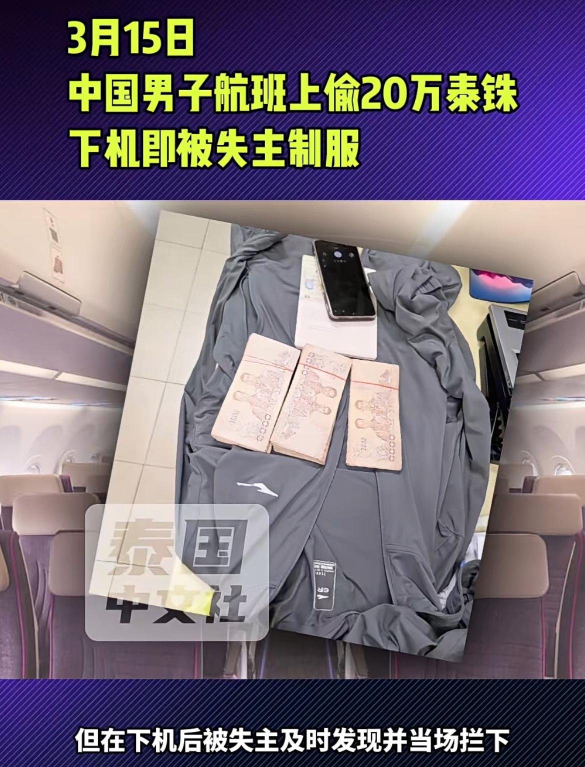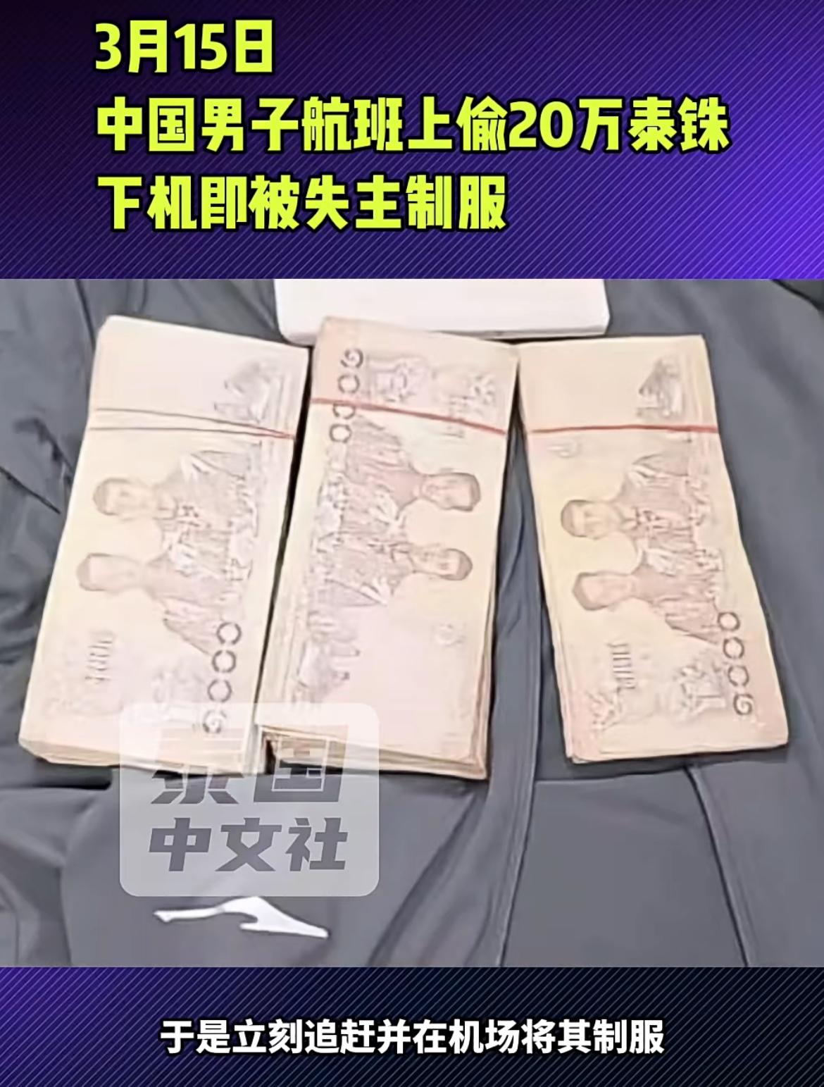 一名中国男子泰国航班上盗窃 20 万泰铢,机场逃离时被事主当场抓获。3 月 12 日从泰国乌隆它尼飞往泰国曼谷的航班上,一名中国男子坐在一个泰国医生旁边,频繁起身弄行李,飞机落地后泰国医生检查行李,发现包内 20 万现金被盗,怀疑是邻座中国男子所为,赶紧下机追赶,在机场通道当场抓住该名男子。报警后警察在男子身上搜出 20 万现金泰铢。不久又有其他外国夫妇报警,声称财物被丢。警察怀疑该名中国男子是团伙作案,有待后续进一步的调查。真是丢人丢到天上。