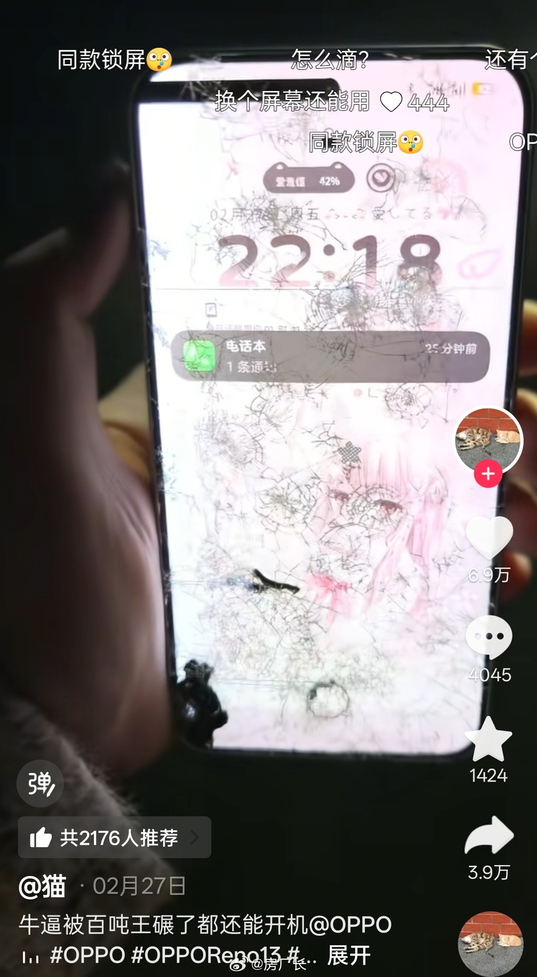 妹子的OPPO Reno13被百吨卡车碾压,正反两面都碎碎的,但是摄像头完好,还能开机点亮屏幕
