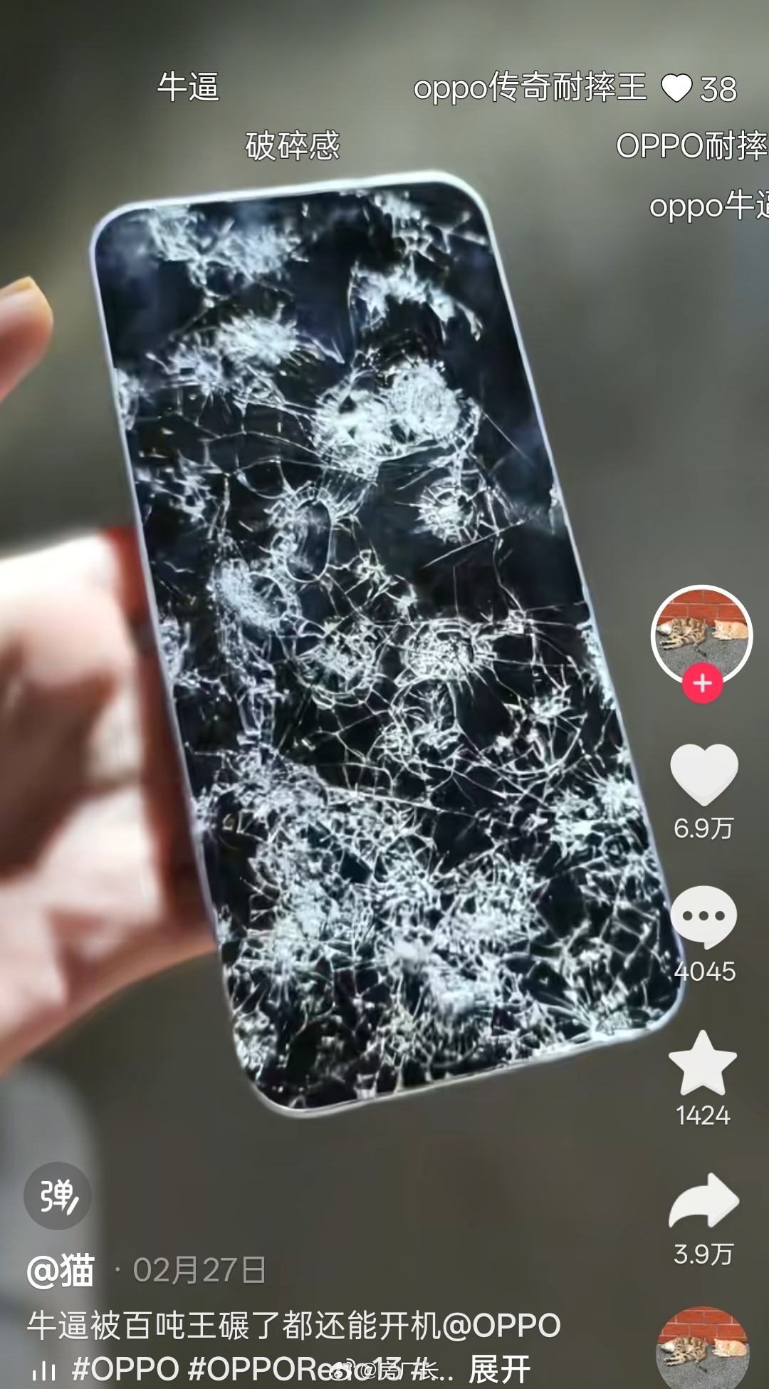妹子的OPPO Reno13被百吨卡车碾压,正反两面都碎碎的,但是摄像头完好,还