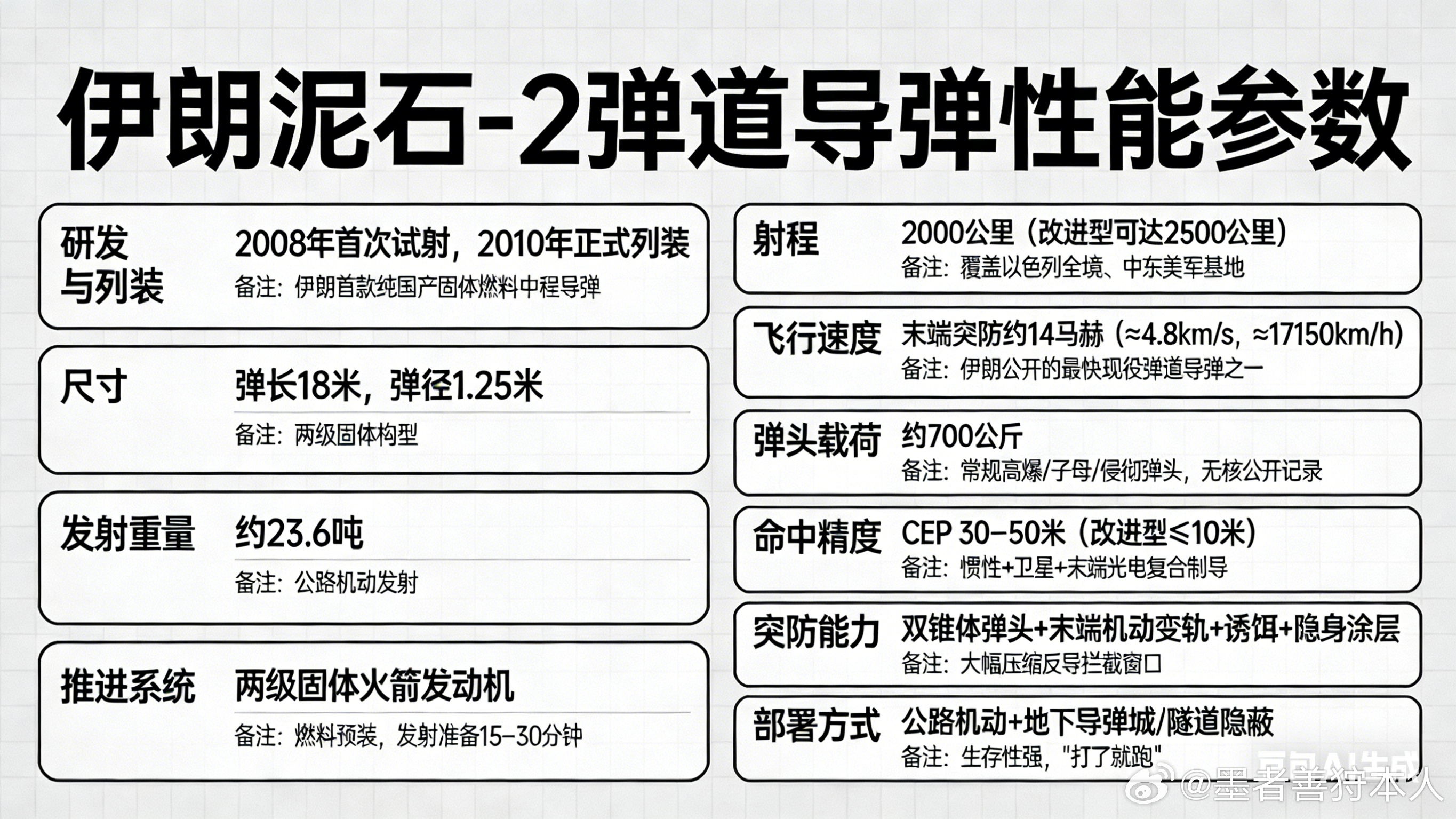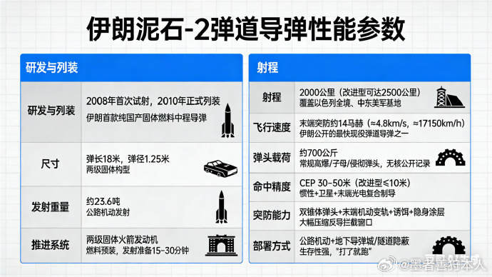 ✅ 核心性能参数(以泥石-2为主) 🔹 研发列装:2008年首次试射,2010年正式列装,是伊朗首款纯国产固体燃料中程导弹 🔹 基础规格:弹长18米、弹径1.25米,发射重量约23.6吨,采用公路机动发射 🔹 推进系统:两级固体火箭发动机,燃料预装,发射准备仅需15–30分钟 🔹 关键战力:射程2000公里(改进型可达2500公里),覆盖以色列全境及中东美军基地;末端突防速度约14马赫,CEP精度30–50米(改进型≤10米) 🔹 弹头配置:约700公斤载荷,可搭载常规高爆、子母、侵彻弹头,无公开核部署记录