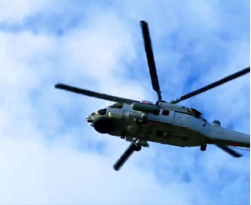 这架海军的直二十,左侧小翼下挂载的是什么设备?不太像是副油箱,倒是有点类似于可收放的拖弋声纳。这一架直-20机头下方由对海搜索雷达,两侧的小翼和直-20F反潜型的鱼雷挂架不一样,带有点像直-20J的小翼,是一个奇怪的型号。