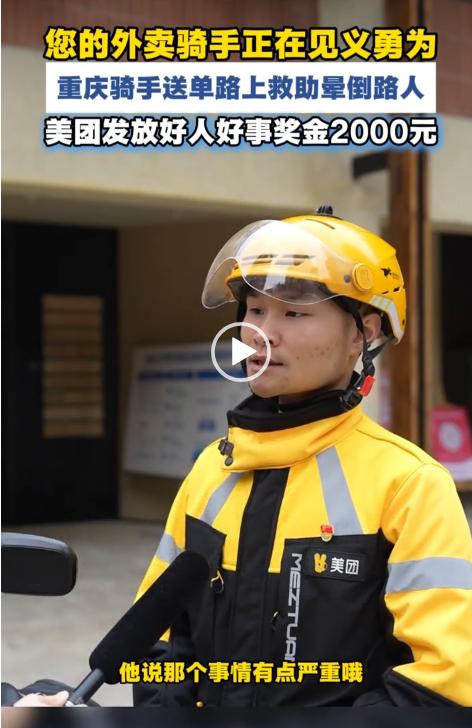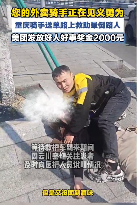 今天看到了美团骑手周云川见义勇为的新闻,我的内心满是触动与敬佩。 在很多人印象里,外卖骑手的日常似乎只有穿梭街巷、争分夺秒送单,却未曾想,当危险来临、生命告急时,他们能毅然放下手中的订单,挺身而出,用平凡的举动扛起不凡的担当,美团骑手周云川,就是这样一位温暖又有力量的暖心小哥。 事情发生在3月4日的重庆两江新区尚文大道路口,一名路人突然倒地不起,周围很快围起了围观的人群,大家虽心存担忧,却没人敢轻易上前帮扶。 正在附近送单的周云川恰巧途经此处,看到这一幕后,他立刻停车,快步上前查看情况。起初,围观群众大多以为倒地者是醉酒昏睡,可周云川俯身靠近后发现,对方身上没有丝毫酒味,且意识全无、呼吸微弱,情况十分危急。 没有丝毫迟疑,他第一时间掏出手机拨打120急救电话,随后便一直蹲在伤者身边,密切观察其状态,轻声呼唤着伤者,寸步不离地守护在旁,用行动给周围的人吃下了一颗“定心丸”。 救护车呼啸而至后,周云川依旧放心不下,主动放弃了手中的送单任务,一路陪同医护人员将伤者送往西南医院。 途中,他仔细回忆并向医护人员详细说明伤者的现场状态,助力医护人员快速掌握情况。直到看着伤者被推进抢救室、确认其脱离生命危险后,他才悄悄转身离开,匆匆赶去完成那些被耽误的订单,没有丝毫张扬。 事后,为表彰周云川的见义勇为之举,美团专门为他颁发了“先锋骑手”荣誉称号,并发放2000元好人好事专项奖金。我觉得有点少,应该最少5000元。 这位暖心小哥不仅是一名尽职尽责的外卖骑手,还是一名党员骑手、跑单小队长,从事外卖行业已有近5年时间,始终用责任与善意对待每一件事。 他的善举值得被铭记,而美团平台的正向激励,更让我们看到了社会对见义勇为行为的认可与鼓励,也让更多人相信,平凡之中,总有不凡的光芒在闪耀。美团骑手 外卖员救人事迹