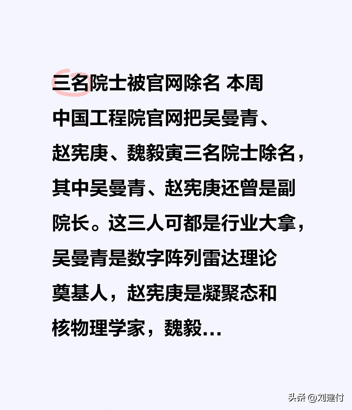 三名院士被官网除名 本周中国工程院官网把吴曼青、赵宪庚、魏毅寅三名院士除名,其中吴曼青、赵宪庚还曾是副院长。这三人可都是行业大拿,吴曼青是数字阵列雷达理论奠基人,赵宪庚是凝聚态和核物理学家,魏毅寅是导弹领域领军专家。 其实这不是第一次有院士被除名了,2026 年 2 月罗琦、刘仓理等顶尖人才也被调整。中国工程院作为国家战略科技力量,对院士队伍从严治理。《中国工程院章程》明确了对违规院士的处理办法。这一系列操作释放出清晰信号,院士队伍建设正走向规范化、动态化、从严化。