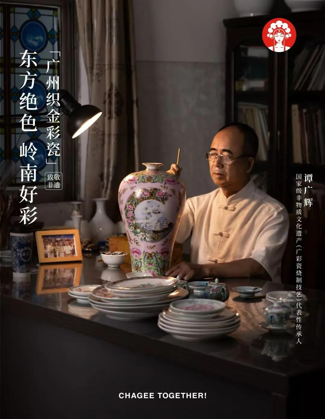 访“广彩瓷”国家级非遗传承人、广东省工艺美术大师———谭广辉,他在熟练掌握广彩传统技法的基础上,大量吸收西洋画的手法,与中国画画法有机结合,形成了色彩绚丽、图案工整、画工精细的独特风格,尤其擅长“长行人物”的表现方法。广秀非遗文化 广非遗计划 广彩莲花瓶 广东工艺美术 广彩三百年 广盈陶瓷 八彩工艺