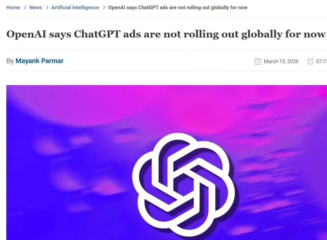 3月16日消息,据bleepingcomputer报道称,针对近期关于ChatGPT广告将向全球用户扩张的猜测,OpenAI正式澄清,其广告业务目前仍严格限制在美国境内,尚无在全球范围内推出的具体计划。
