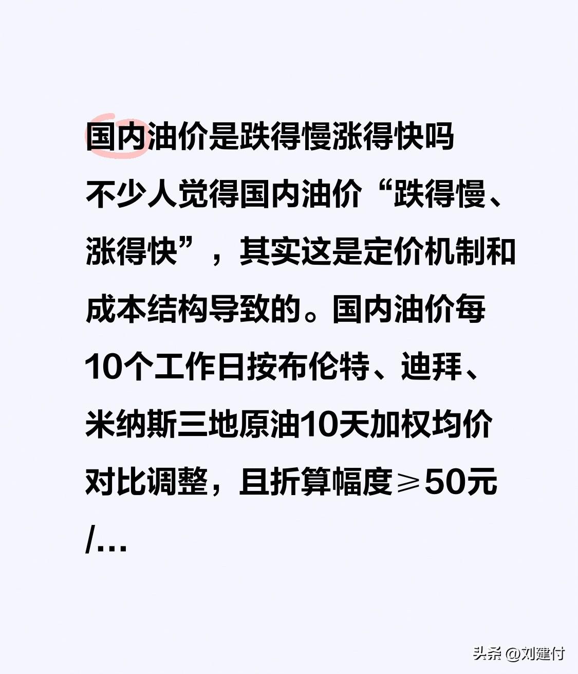 国内油价是跌得慢涨得快吗 国内油价是否跌得慢涨得快?不少人认为国内油价“跌得慢、涨得快”,这实则由定价机制和成本结构所致。国内油价每10个工作日根据布伦特、迪拜、米纳斯三地原油10天加权均价对比进行调整,且折算幅度≥50元/吨才会调价。 油价上涨时,连续上涨易快速累积,轻松突破阈值,调价干脆;下跌时,末期大跌会被前期高价摊薄,降幅易被平均,还常因小幅震荡多次搁浅,让人感觉“跌不动”。再加上40美元地板价和刚性税费(占40% - 50%)的影响,极端下跌时国内“不跟跌”,进一步加深了这种印象。不过从长期看,国内油价与国际趋势基本匹配。
