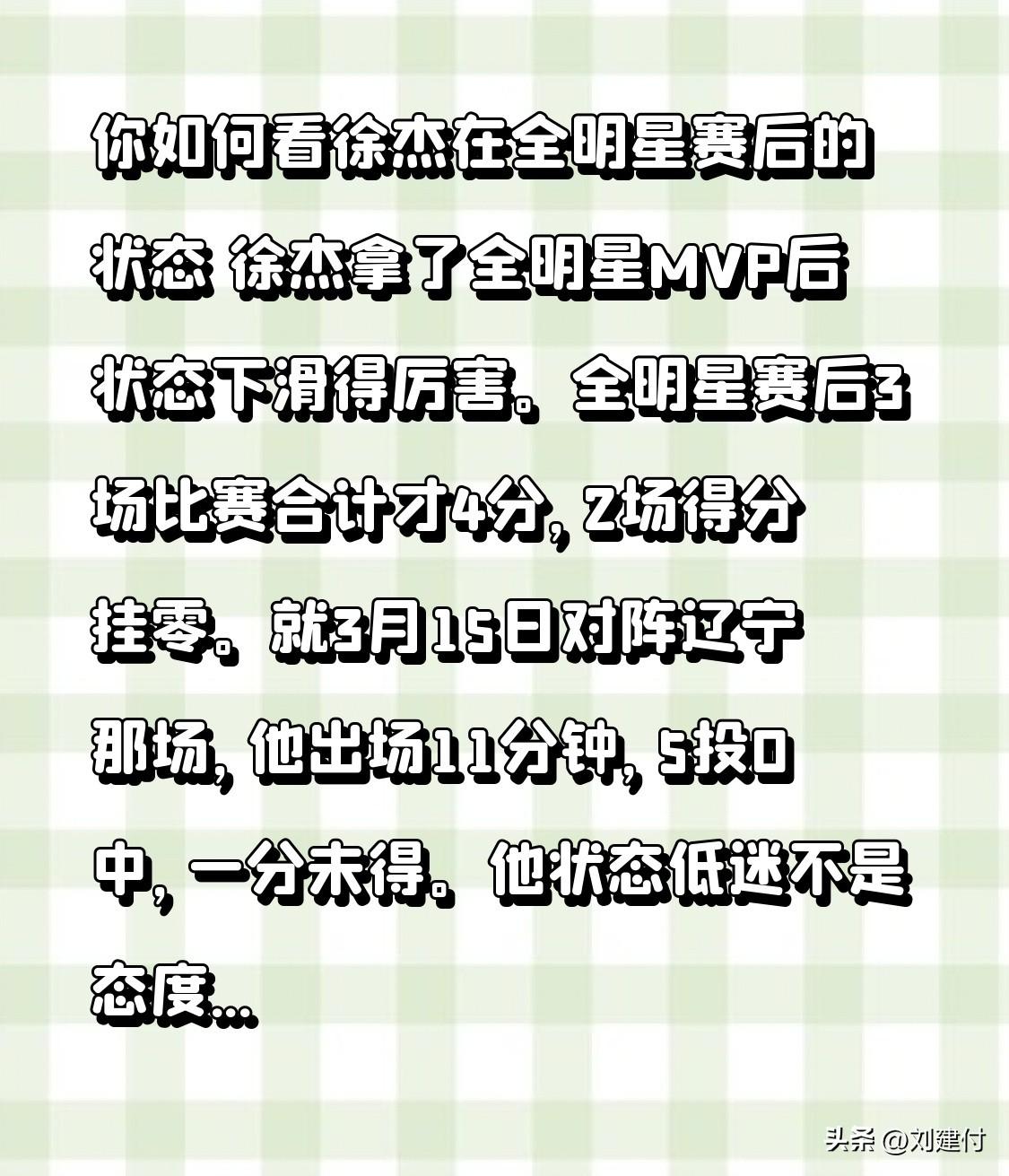 你如何看徐杰在全明星赛后的状态 你如何看待徐杰在全明星赛后的状态?徐杰拿到全明星MVP后,状态下滑明显。全明星赛后的3场比赛,他总共只得到4分,其中2场得分挂零。3月15日对阵辽宁的比赛,他出场11分钟,5投0中,一分未得。 他状态低迷并非态度问题,而是受身体、球权和战术等因素综合影响。第一阶段外援伤停,他被杜锋委以重任,出战时间长,身体透支且受伤,突破的爆发力和协调性都有所下降。此外,广东队有不少持球型外援,他的球权减少,从核心变成无球侧翼,只能蹲底角,没球在手就难以发挥。不过对阵深圳时,杜锋让他持球,他马上有得分和助攻,这说明战术安排很重要。希望他能尽快调整状态。