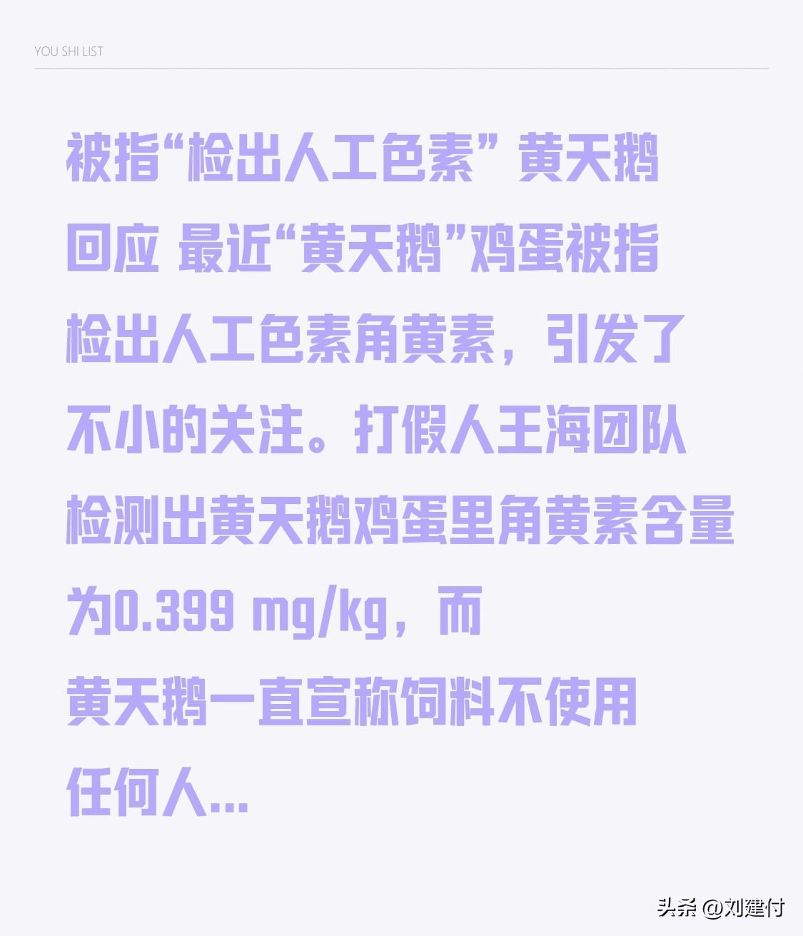被指“检出人工色素” 黄天鹅回应 被指“检出人工色素”,黄天鹅回应 近日,“黄天鹅”鸡蛋被指检出人工色素角黄素,引发广泛关注。打假人王海团队检测显示,黄天鹅鸡蛋里角黄素含量为0.399 mg/kg,而黄天鹅一直宣称饲料不添加任何人工色素。 黄天鹅回应称,角黄素在自然界天然存在,检出并不等同于人工添加,该数值处于天然水平。此外,其每年采购天然植物提取物成本达上千万元,微量添加角黄素对改善成本作用甚微,且现有设备添加还存在安全隐患。同时,黄天鹅愿意接受复检并配合监管。然而,此次涉及的6个品牌鸡蛋均检出角黄素,“野迹鸣”一款还超标。此事究竟如何,仍需等待进一步调查结果。