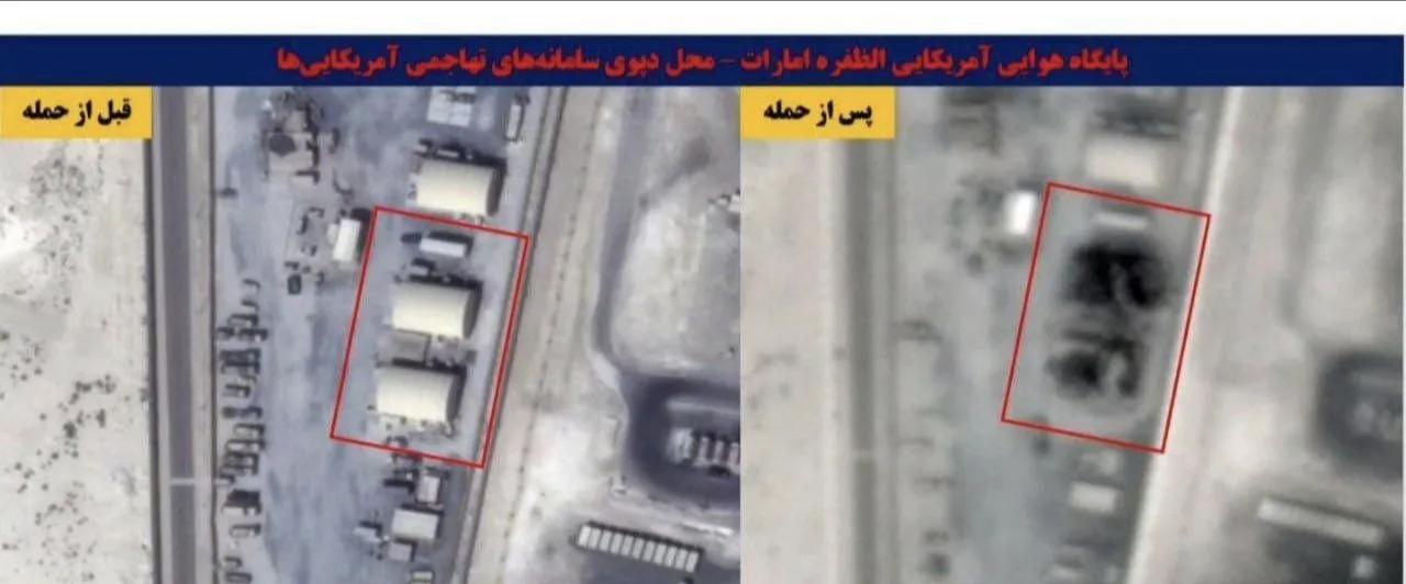 伊朗发布了导弹打击美国在阿联酋达夫拉空军基地的卫星图像,可见两座机库被摧毁。 伊朗在太空中是有多颗成像卫星的,包括军用的努尔系列侦察卫星,民用的帕亚、扎法尔-2、海亚姆遥感卫星。在最近的战争中,伊朗的成像卫星发挥了关键的情报支持、目标引导与战果评估作用。