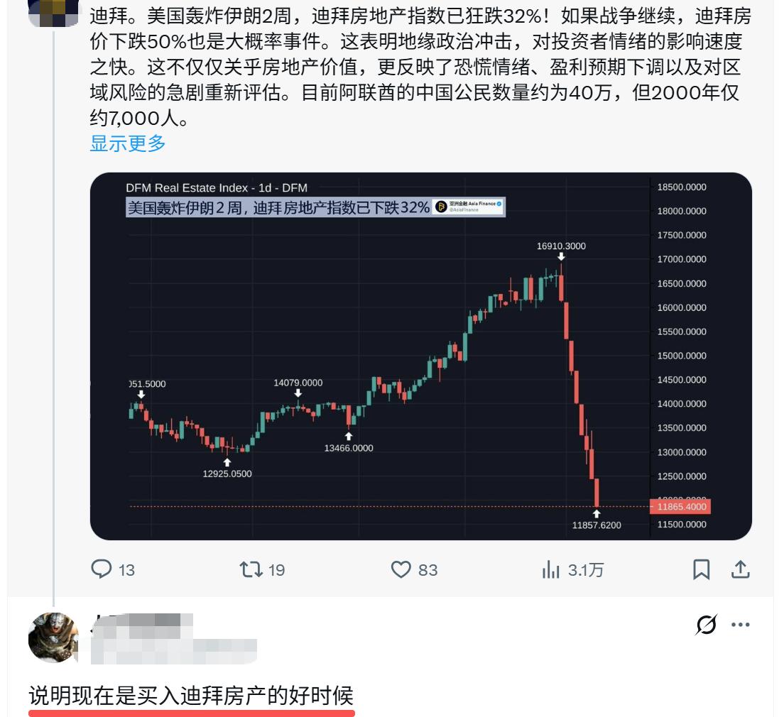 迪拜房地产已狂跌32%! 如果战争继续,下跌50%是大概率事件。 有人说:“现在