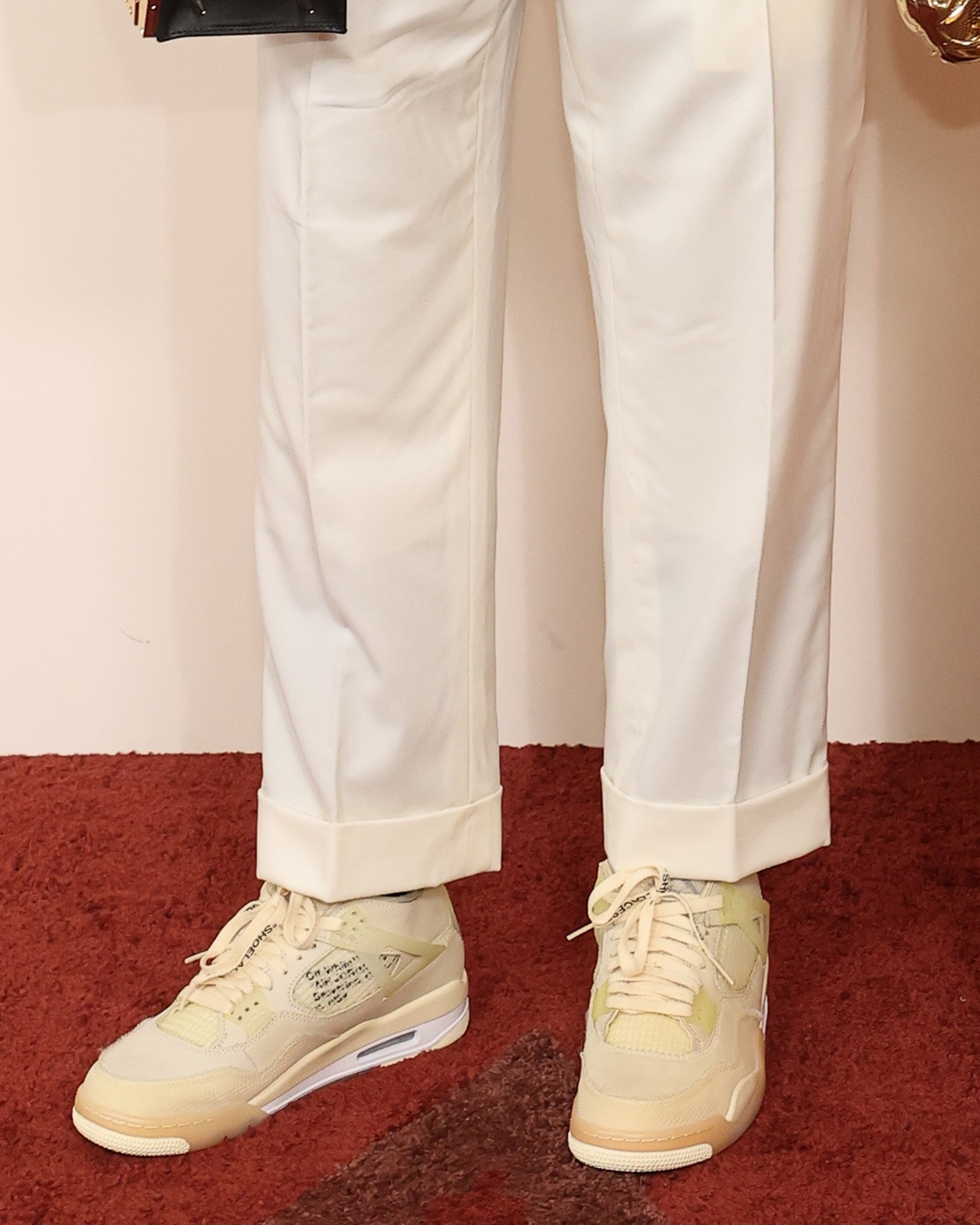 著名导演斯派克·李在今年的奥斯卡颁奖典礼上,脚踩一双 OW x Air Jordan 4 “Sail” 联名亮相。