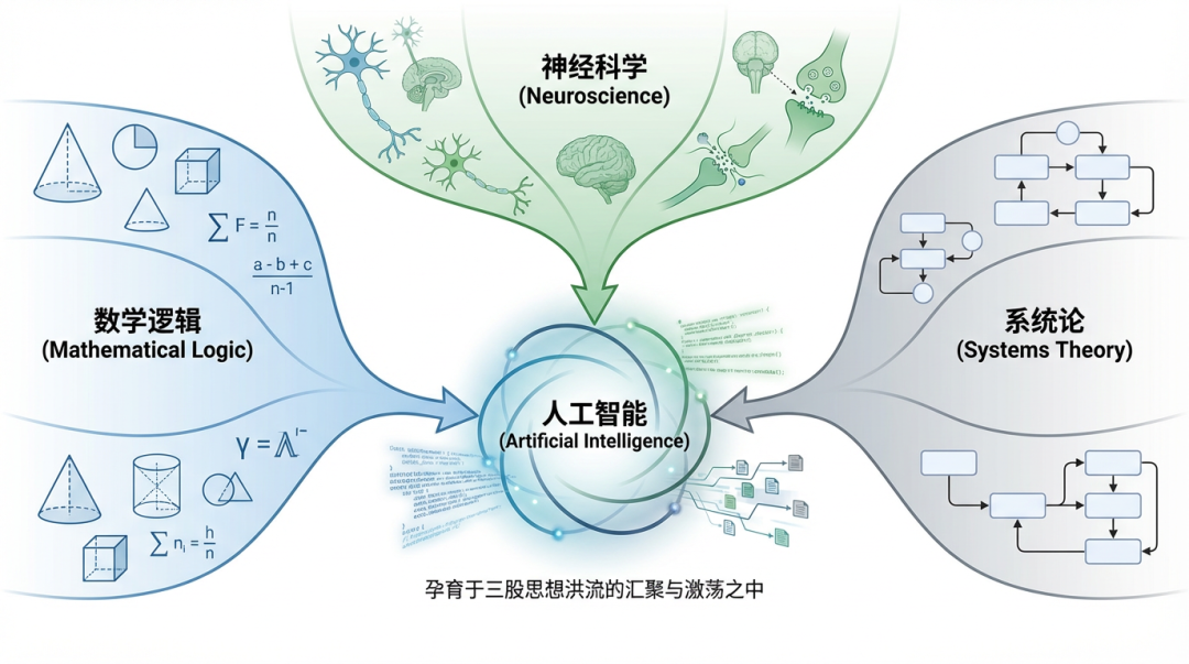 人工智能并非诞生于某个天才的单一灵感,而是孕育于数学逻辑、神经科学与系统论三股思想洪流的汇聚与激荡之中。