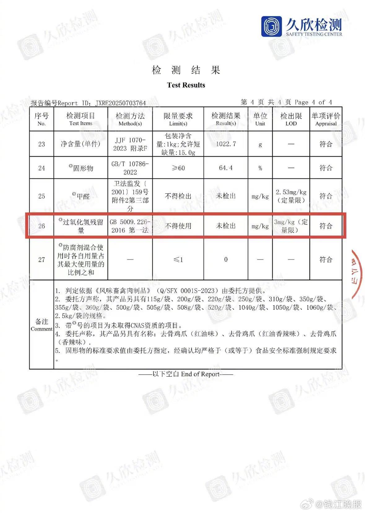 同时,商家披露,自2025年2月《食品安全国家标准 食品添加剂使用标准》执行以来,已对上述产品开展2次连续抽检,检测报告均显示“过氧化氢残留量(双氧水)未检出”,结果合格。