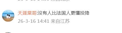 3月15日,法国总统马克龙表示,他与伊朗总统佩泽希齐扬通了电话。他在社交帐号上写道:“我刚才与伊朗总统佩泽希齐扬通了电话。我呼吁他立即停止伊朗直接或通过其代理人(包括在黎巴嫩和伊拉克的代理人)对该地区国家发动的令人无法接受的袭击。” 有位网友的评论让我破防了!这位网友讲:“没有人比法国人更懂投降。” 想想也是,马克龙的“呼吁”,简言之不就是相当于叫伊朗投降吗?这确实引人想起二战时的法国,面对纳粹德国的进攻,法国在开战后40多天就选择了投降,而不是拼死抵抗侵略。看来,即使80多年过去了,法国还是那个德性,投降基因依旧在! “呼吁”伊朗单方停止攻击而不是同时“呼吁”美国以色列也停止攻击,就是双标。一碗水都不能端平就跟伊朗总统通话,马克龙是咋想的?是不是觉得最近国际头条没有他的新闻呢?!