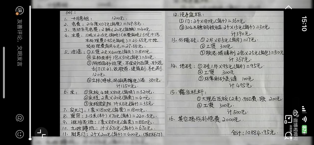 一网友遭遇史上最严格的提灯定损,江西老表看了都要喊一声师傅。1200 的房租却被要求赔偿 10880元的损失。房东像小学生检查作业一样,房子里所有的家具、电器都拿着老花镜仔细检查,不放过任何一个细节,所有有问题的点都用美纹纸贴上。事后,房东拉出了详细的赔偿清单,每一样有材料费用,还有工时费,加起来有十几样的损失,总共 10880,有零有整。遭遇如此奇葩的房东,该名网友真是活见鬼了。