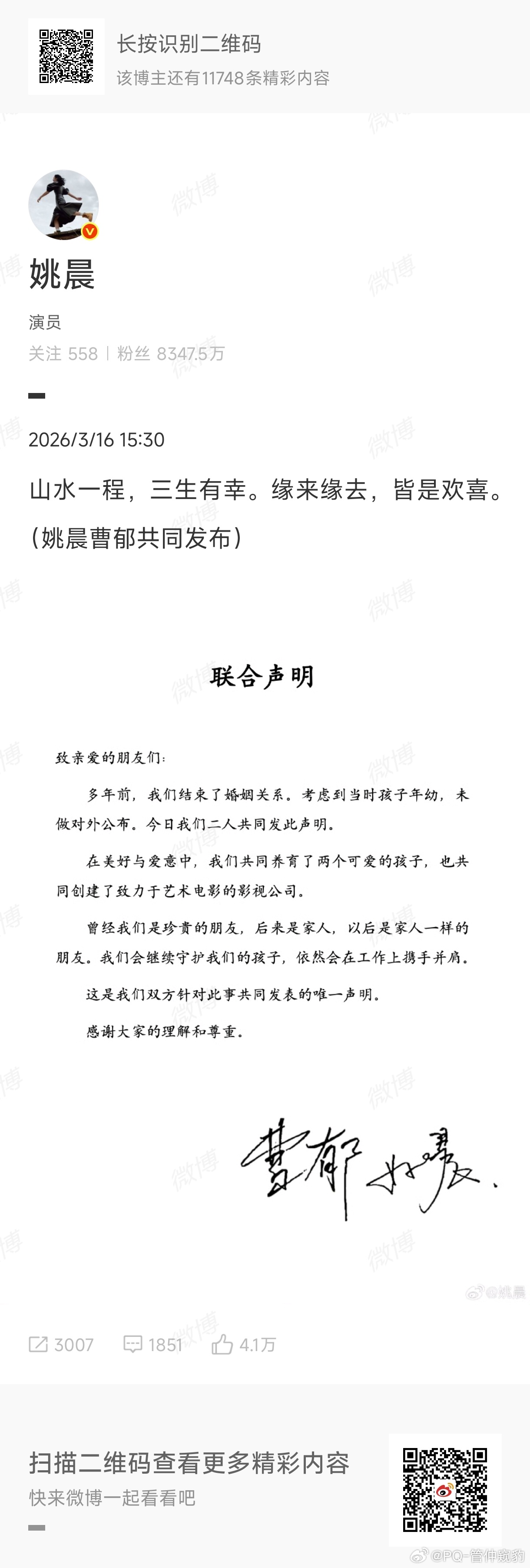 姚晨曹郁官宣离婚 恭喜祝愿姚晨人生三原则不行就分,重启试试,多喝开水