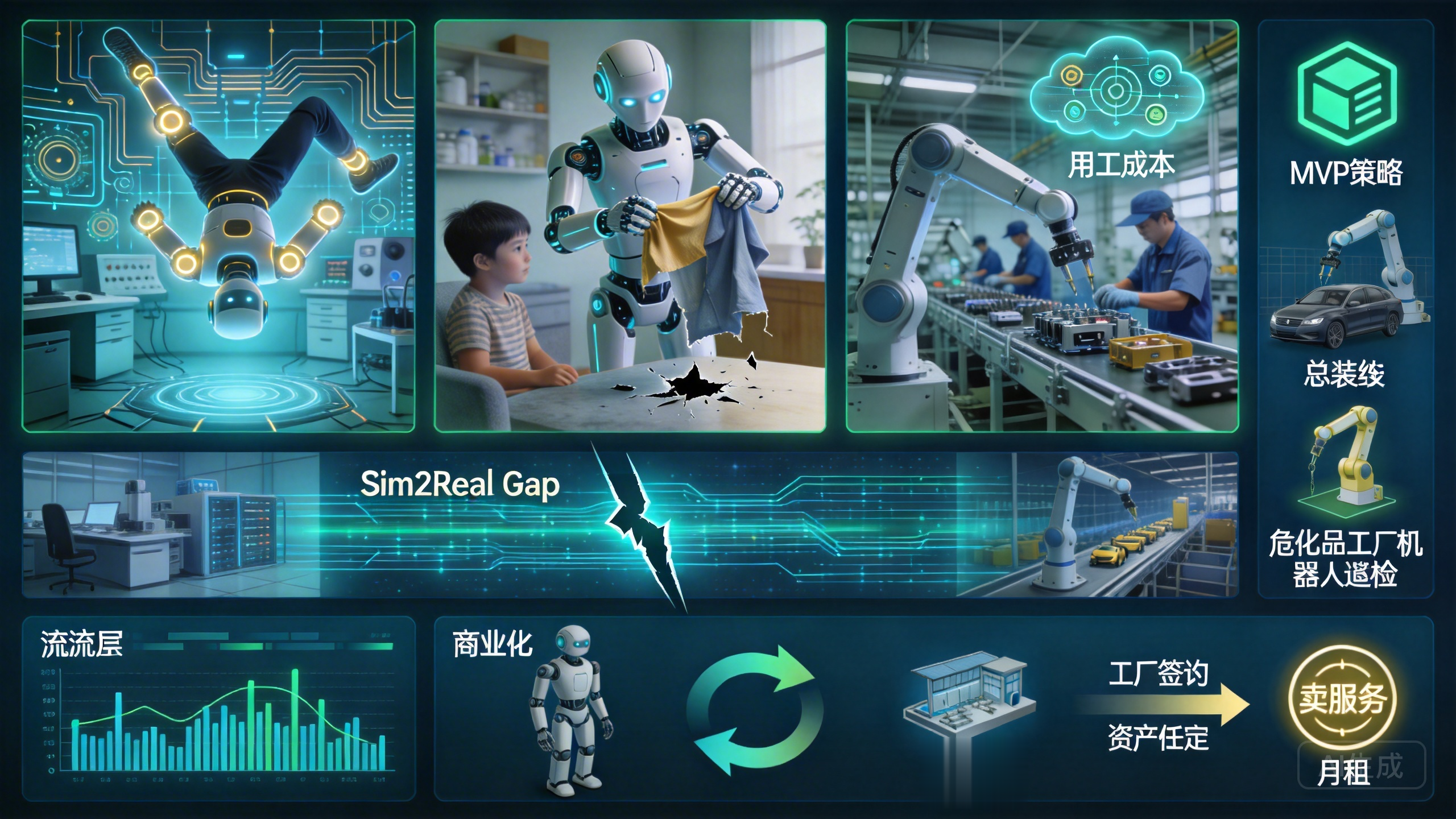 MVP策略:不要追求一出厂就能干100种活。先锁定极度垂直的场景,比如:汽车总装线上的零件分拣、危化品工厂的巡检。让机器人在真实的物理反馈中试炼智能(基于物理世界模型的具身智能)。