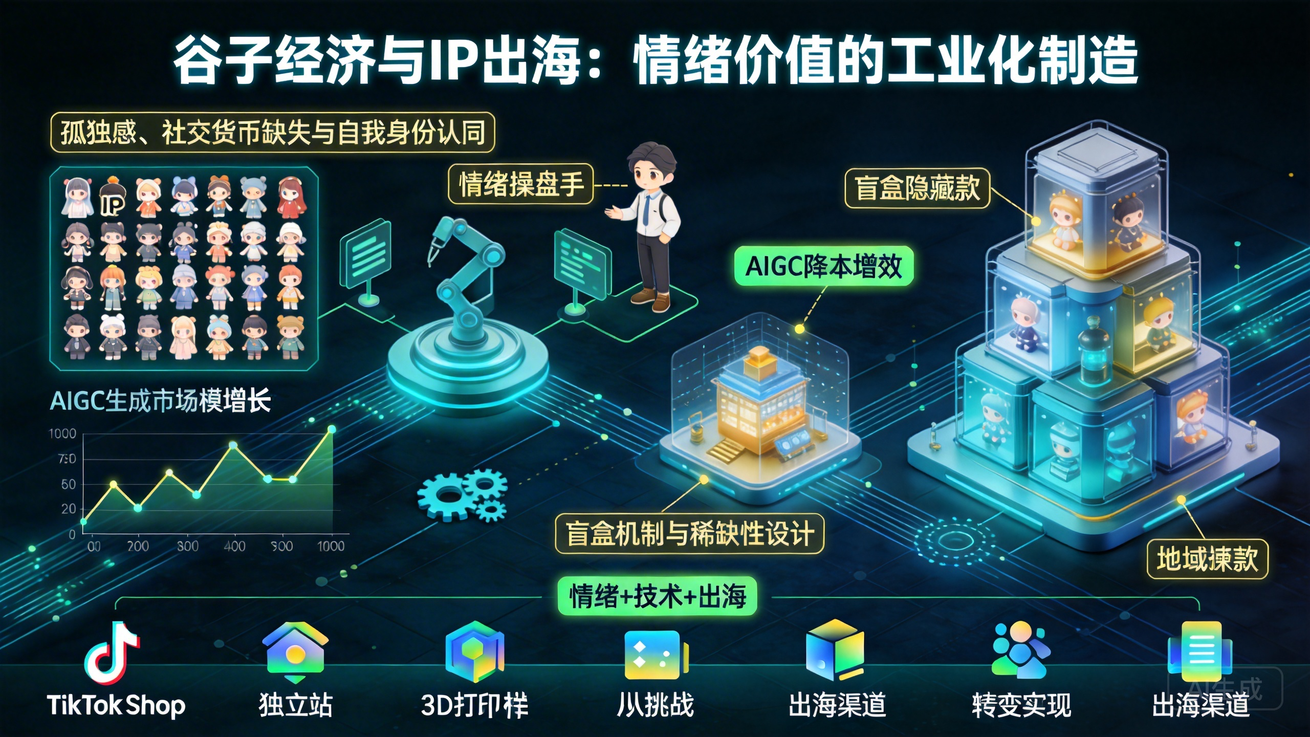 跑通“情绪+技术+出海”的铁三角。前端用内容(动漫、游戏)捕捉情绪并形成IP;中端用AIGC和柔性供应链极致压缩生产成本;后端利用中国成熟的出海渠道(如TikTokShop、独立站)将潮玩倾销全球,赚取发达国家的“情绪溢价”。这也是为什么泡泡玛特能在海外重塑千亿市值的核心逻辑。