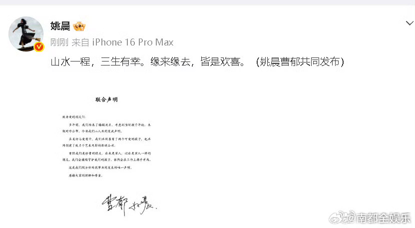 姚晨曹郁多年前已离婚 姚晨曹郁官宣离婚姚晨曹郁离婚声明 今日,和曹郁发布联合声明官宣离婚:“多年前,我们结束了婚姻关系,考虑到当时孩子年幼,未做对外公布”,“曾经我们是珍贵的朋友,后来是家人,以后是家人一样的朋友。”据悉,两人2011年恋情曝光,2012年在新西兰举行婚礼,2013年7月15日,儿子“小土豆” 出生,2016年11月9日,小女儿“小茉莉”出生。