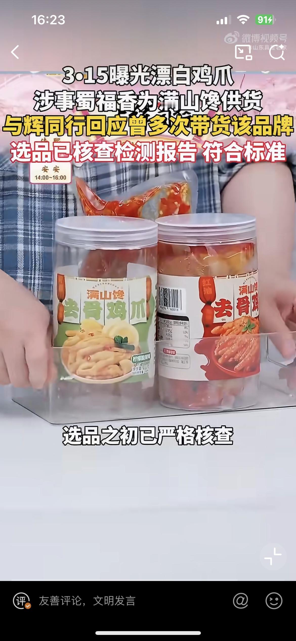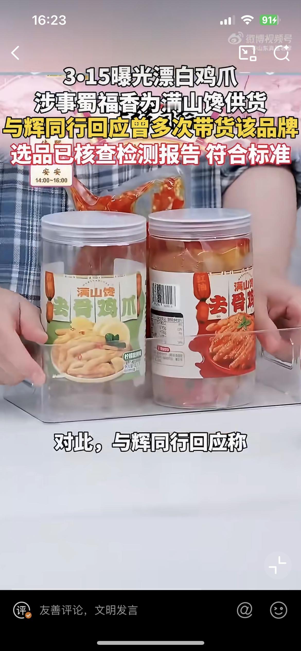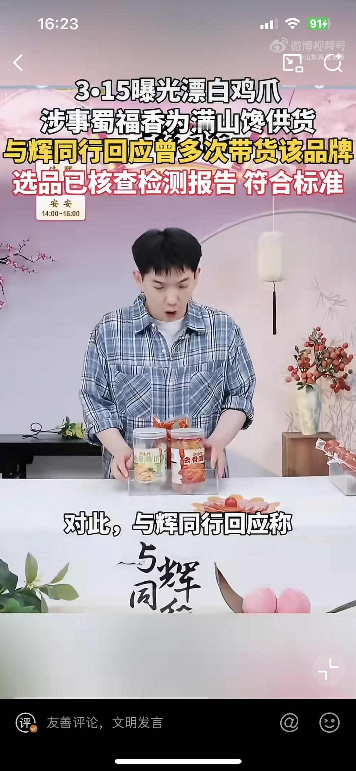 与辉同行曾带货被 315 曝光问题鸡爪,涉事品牌满山馋。与辉同行回应之前带货的鸡爪不是同一批次,有商家的检测报告为证,对于这样轻飘飘的回应你们相信吗?反正鸡爪已经吃到肚子里,也没啥问题,现在就是死无对证了。昨天 315 晚会曝光双氧双氧水浸泡鸡爪,众多涉事企业被封被查,上架商品纷纷下架。作为国内头部带货平台,宇辉同行曾经销售过满山馋这个鸡爪品牌,其和曝光的工厂是合作关系。
