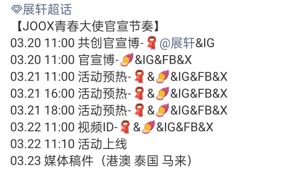 展轩JOOX青春大使展轩「JOOX青春大使」官宣节奏🈶03.20 11:00共创官宣!03.21 活动预热03.22 11:00 视频ID 11:10 活动上线!展轩JOOX青春大使官宣节奏