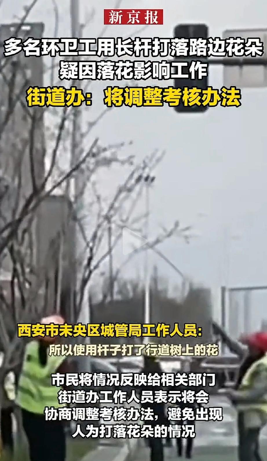 过分了!西安未央区龙朔路,春暖花开,路边的行道树本来开得正好,没成想环卫工人却拿着长杆打落行道树的花朵,市民看见了,投诉到城管局,街道办:将调整环卫考核办法! 3月15日,春暖花开未央区龙朔路,路边的行道树本来开得正好,可好几名环卫工人却拿着长长的竹竿,对准树上的花朵使劲敲打 ,花瓣哗啦啦落了一地,看着真叫人心疼。 好好的花,为什么要打掉?原来是有人担心,这花瓣老往下落,地扫不干净,会影响工作考核 。 咱也别急着骂工人,先听听他们为啥这么做 这事儿听起来挺气人,但你得往深了想一想。 春天风大,花瓣不停地飘,对于环卫工来说,这就意味着刚扫完的地,转眼又是一层“垃圾”。 在一些严格的考核标准里,地上有落花就算“不干净”,可能要扣钱 。工人们也是没办法,与其一遍遍追着落花跑,累得直不起腰,还不如“狠下心”,把树上的花一次性都打下来,扫干净了就能消停一阵子 。 他们不是不爱花,是实在被这“不能见一片落叶”的指标给逼急了。 有网友说:“这简直是焚琴煮鹤!为了省事把花都毁了,那城市要绿化干嘛?不如直接种假树!”话虽然冲,但理不糙。我们把花都打掉了,城市是“干净”了,可那份属于春天的生机和浪漫,也彻底没了! 是啊,但凡有别的办法,谁舍得亲手毁掉这美景?问题出在哪?就出在那个不近人情的考核办法上 。这就好比,怕孩子吃饭弄脏衣服,就不让他自己吃饭一样。我们的管理,怎么能“懒”到这个地步? 好在未央区城管局和街道办很快就回应了,说会协商调整考核办法,避免再出现这种人为打花的情况 。这是一个好的开始。 说到底,城市管理,不能只有冷冰冰的指标,更要有温度。 落花不是垃圾,那是“化作春泥更护花”的生命轮回,是城市里难得的诗意。 我们希望,未来的考核能更人性化一点,多体谅体谅一线工人的难处,也多尊重一点自然的美。 千万别再让我们的环卫工人,为了保住饭碗,变成那个亲手“赶走春天”的人了。一个真正美好的城市,既要容得下整洁的路面,更要容得下那几片随风飘落的花瓣。