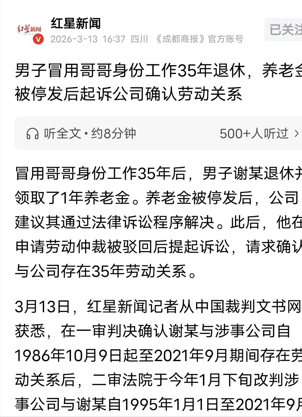 宁夏,哥哥犯罪蹲监狱,男子冒名顶替了哥哥的工作,一干就是35年,退休后,领了1年退休金,就被公司停发,男子申请劳动仲裁被驳回,他告上法院,要求确认自己与公司存在35年劳动关系,法院一审判决:存在35年劳动关系。公司不服,提出上诉,二审判决有不同看法。 2022年的某天,社保系统后台突然跳出一串刺眼的红色预警代码。 屏幕上的数据极其荒谬:一个正蹲在大牢里服无期徒刑的重刑犯,居然每个月都在准时从银行账户里领走一笔数目不小的退休金。 系统瞬间锁死了这个诡异的账户,资金停发。这冰冷的算法不仅切断了一条养老钱的输送管道,更直接撕开了一场在宁夏国营单位里潜伏了整整三十五年的惊天骗局。 时间得往回倒推到1986年的深秋。在那个年代,“国营编制”这四个字简直就是一块免死金牌。 只要你端上了这只铁饭碗,这辈子基本就和吃糠咽菜彻底绝缘了。 谢家老大原本就是那个被命运眷顾的幸运儿,凭本事考进了体制内。 可这人偏偏是个扶不起的阿斗,早年因为偷鸡摸狗被扔进劳教所蹲了三年,出来后更是变本加厉,直接犯下重案被判了无期。 眼看着全家唯一一张长期饭票就要成废纸,谢家老二动了心思。 既然亲哥去不成了,这天大的便宜总不能白白让给外人。他一咬牙,揣着大哥的证件,大摇大摆地跨进了单位的大门。 谁能想到,这一顶替,就是整整三十五个寒暑。 老二在单位里一向任劳任怨,干活从来都是拼尽全力,从不含糊。单位按月发工资、交社保,一切看起来都那么顺理成章。 在 1988 年、2005 年和 2006 年,他更是面不改色,以 “大哥” 的身份,接连续签了好几份劳动合同。要说身边的老同事和领导一点都没察觉?这恐怕是在侮辱成年人的智商。 其实所有人都心知肚明,只不过活儿有人干、局面没乱,就没人愿意把话说透。这种灰色的默契,硬是护送着老二一路熬到了满头白发,光荣退休。 2021年,老二顺理成章地办完了退休手续。 拿着每个月打到账上的钱,他原本以为这辈子冒名的惊险游戏终于可以安稳落幕了。直到那场大数据巡检,像一记闷棍砸醒了他的美梦。 钱断了,老二彻底急了眼。他跑到老东家那里讨要说法,公司也是一脸无奈:活儿确实是你干的,可白纸黑字签的都是你大哥的名字,这笔烂账我们怎么认?你去法院告吧。 这老哥也是个硬茬,仲裁走不通,转头就把老东家直接告上了法庭。 他的诉求听起来极其魔幻:我承认我是个骗子,但过去这几十年我流的汗是真的,法院必须承认我们的劳动关系。 这种堪称诈骗的案子,换做常理肯定是被直接打回票。 可一审法官看完卷宗,居然动了恻隐之心。 考虑到他确实冒着严寒酷暑出过工,竟然大笔一挥,判决这三十五年的劳动关系全部成立。 这下轮到公司炸锅了。如果这种冒名顶替的欺诈行为都能得到法律的全面背书,那以后谁还讲规矩?公司二话不说,当场提起上诉。案子被推到了二审法院的审判桌上。 二审法官的判决,堪称一场法理与人情的教科书级博弈。他们没有陷入非黑即白的简单逻辑,而是精准地找到了一把时间的手术刀——1995年。 在1995年《劳动法》正式生效之前,那会儿叫“用工关系”,完全按当时的老规矩办。 法院认定,对于这段处于法律空白期的陈年旧事,现在已经没有权力再回头去追溯管辖了。 但1995年之后的天平发生了倾斜。不管你当时套了谁的壳,只要你实实在在地接受了单位的管理,干了活也拿了钱,这就构成了铁打的事实劳动关系。 《劳动法》就得给你兜底。 终审法槌落下:法院砍掉了前面的九年,确认从1995年1月到2021年9月,这长达26年零9个月的时间里,双方的劳动关系合法有效。 这可真是一次精准的时间切割术。 这份沉甸甸的判决书,简直就是老二晚年的一道救命符。拿着它去社保局,把底账摸清,把那个借用了大半辈子的名字换回自己的真名,这笔养老钱终于算是有了合法的着落。 回头看这场闹剧,老谢能绝处逢生,一半靠的是他那二十多年实打实的汗水,另一半则是吃到了那个特殊时代管理粗放的红利。 要是放在人脸识别无孔不入的今天,他连大门都进不去。 法律终究不是冷冰冰的机器,它在严守底线的同时,也给真实的劳动者留了一线生机。 但这绝不是在鼓励投机取巧。借别人的身份过日子,头顶始终悬着一把达摩克利斯之剑。 在这个处处留痕的算法时代,老老实实做自己,才是最底层的生存智慧。 毕竟,谁也不能保证,下一次大数据的警报响起时,命运还会不会给你留下上诉的机会。 需要我为你提炼这篇文章的情绪锚点和结构反转,做一份适合短视频口播的文本拆解吗? 信源:宁夏一男子冒用哥哥身份工作35年,退休后养老金被停发起诉公司,法院:冒用他人身份签订劳动合同,但存在事实劳动关系2026-03-14 15:20·鲁网