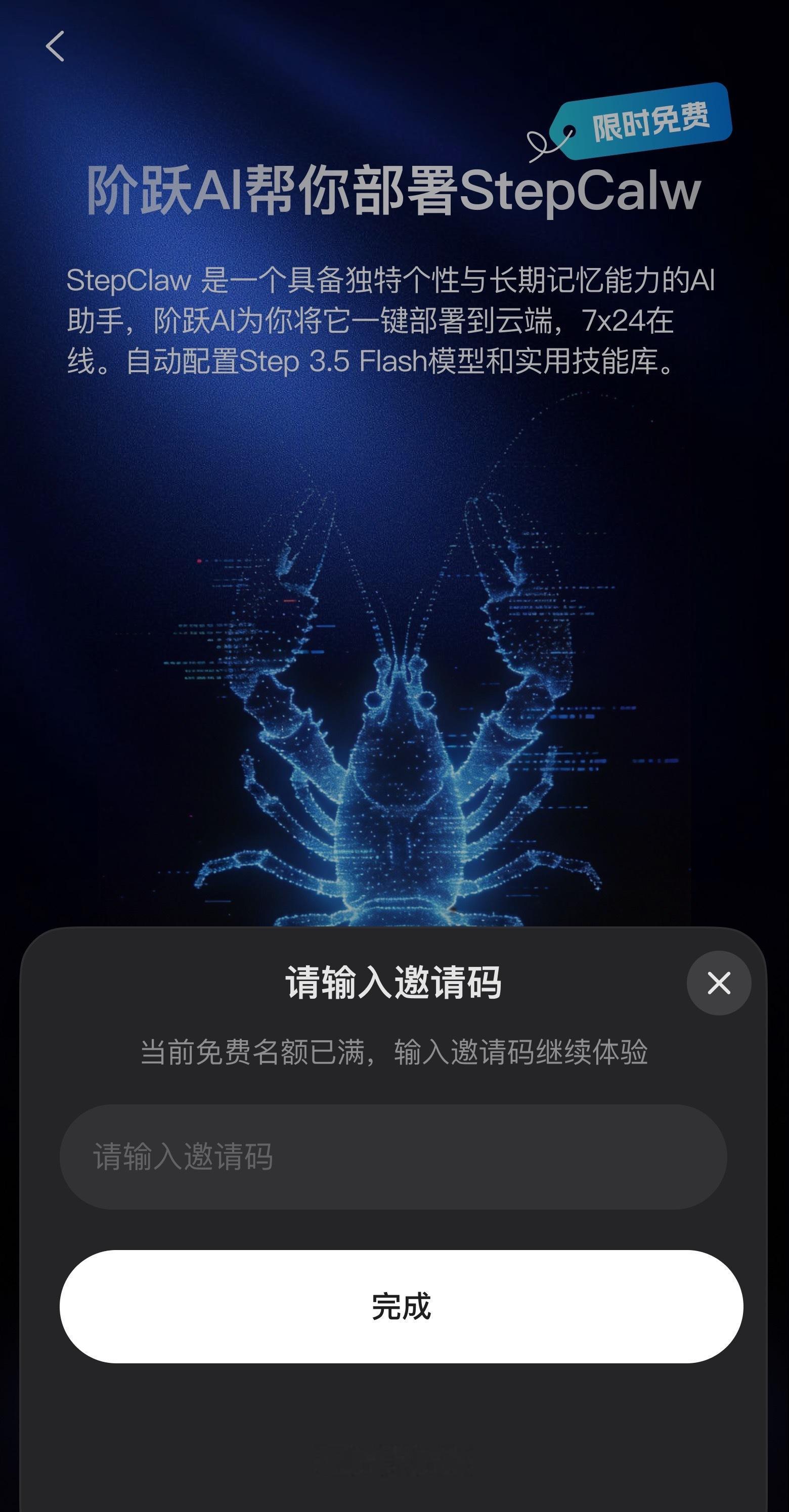 5万份免费AI龙虾被抢光手慢了,连龙虾汤都没喝上🦞 刷到阶跃星辰StepClaw上线,立马跑去阶跃 AI APP 和阶跃 AI Web 端抢免费名额,结果领取的按钮变成灰色的了,领不到好难受啊💔 说好的5000万Tokens呢?说好的0成本云端养虾呢?快还给我!!!求求官方补仓,这次我必冲,谁也别拦我!5万免费龙虾被抢空