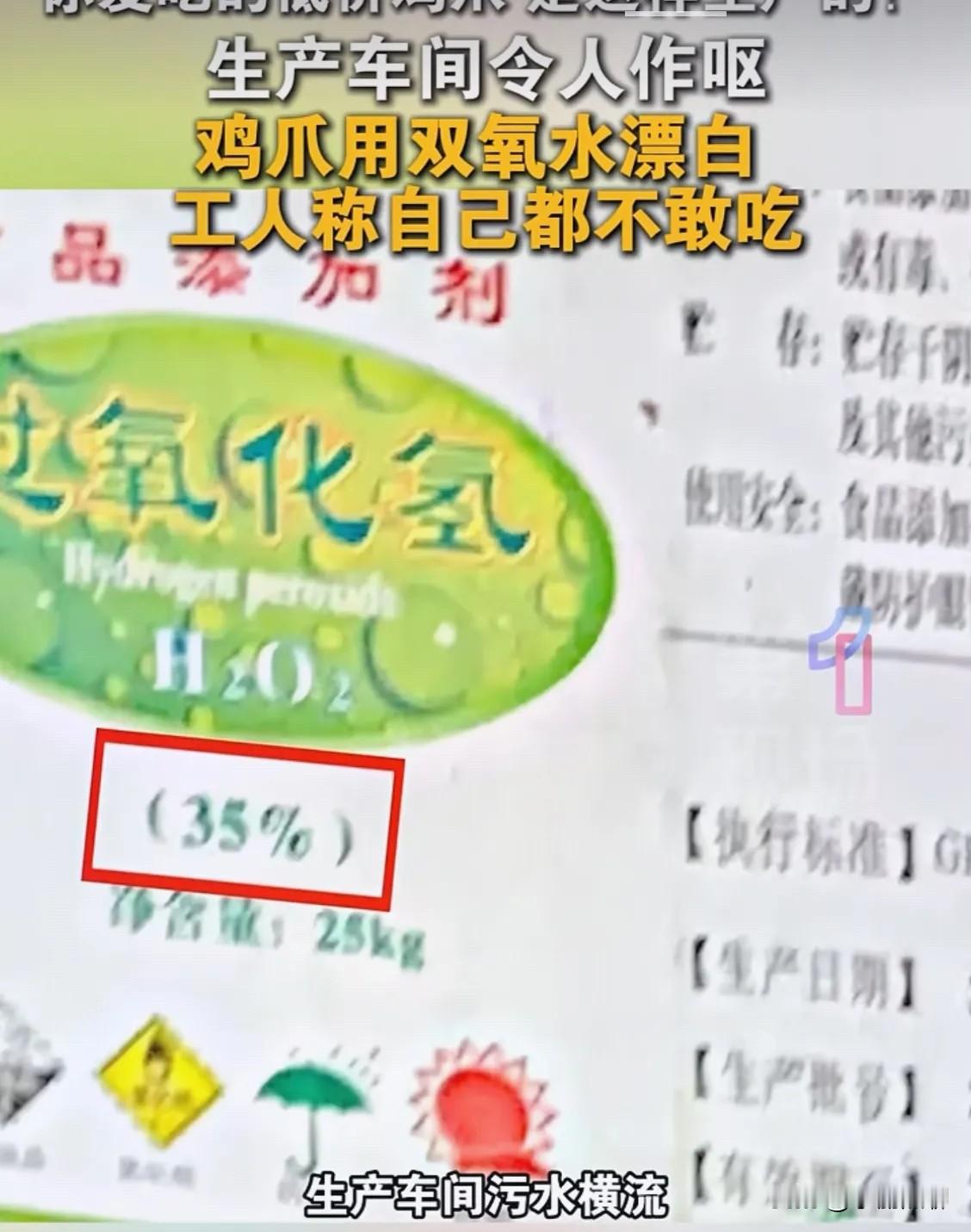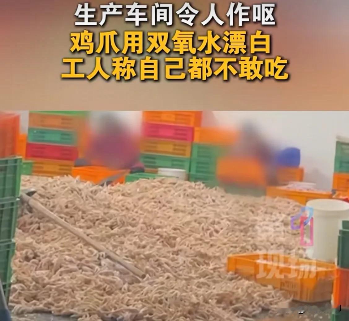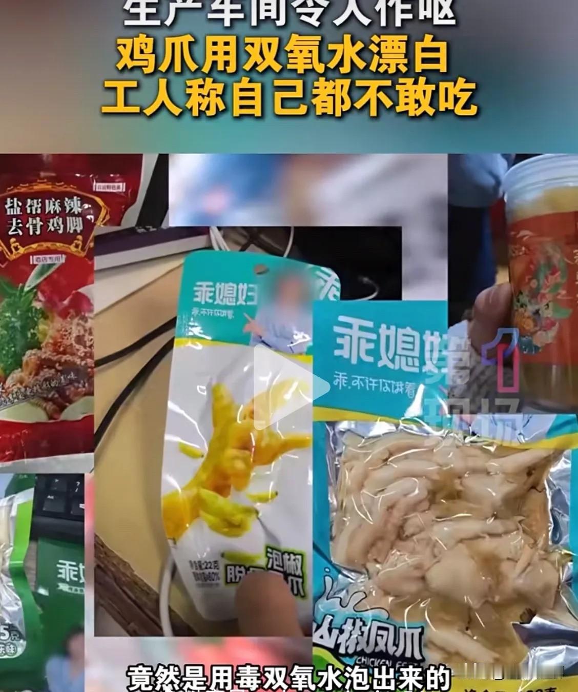 看了315曝光的鸡爪,以后真的是不能再吃了! 大家是不是也吃过袋装的泡椒凤爪或麻辣凤爪?我也喜欢吃,尤其是喝啤酒不知道买啥下酒菜时,弄两袋就能喝五六瓶啤酒,可是昨天看了315的曝光后,我发誓以后再也不吃袋装的凤爪了。 315晚会的记者在鸡爪火爆销售的川渝地区展开调查。 在现场记者进到加工凤爪的车间里,泡制区、修剪区、挑选区臭气弥漫,刺鼻的腥臭味差点让记者吐了出来。 生产环境脏乱不堪,大量鸡爪直接裸露堆放在潮湿肮脏的地面上。有些鸡爪被人员不慎踩踏,工人也只是随手捡起,直接放回加工框中继续使用。 即便环境脏乱,但最终出炉的鸡爪却个个白净诱人,都是因为这个工厂进行了一道关键的漂白工序。 工人告诉记者,这种用双氧水泡过的鸡爪,他们自己从来不吃。 消费者如果长期食用用双氧水浸泡的食品,会造成口腔黏膜损伤、肝肾功能损害等健康危害,超剂量食用则会危及生命。 315每年都会曝光,可是还有商家为了赚钱不顾消费者的健康,生产环境脏乱差,还使用对人体有害的漂白剂,食品安全问题到底什么时候才能彻底解决?
