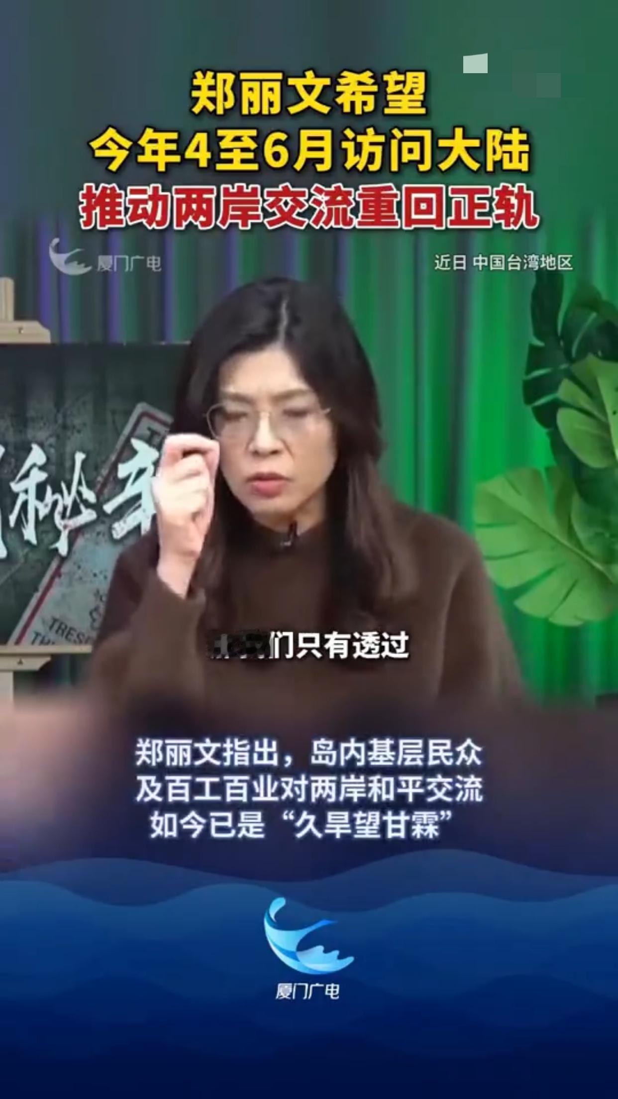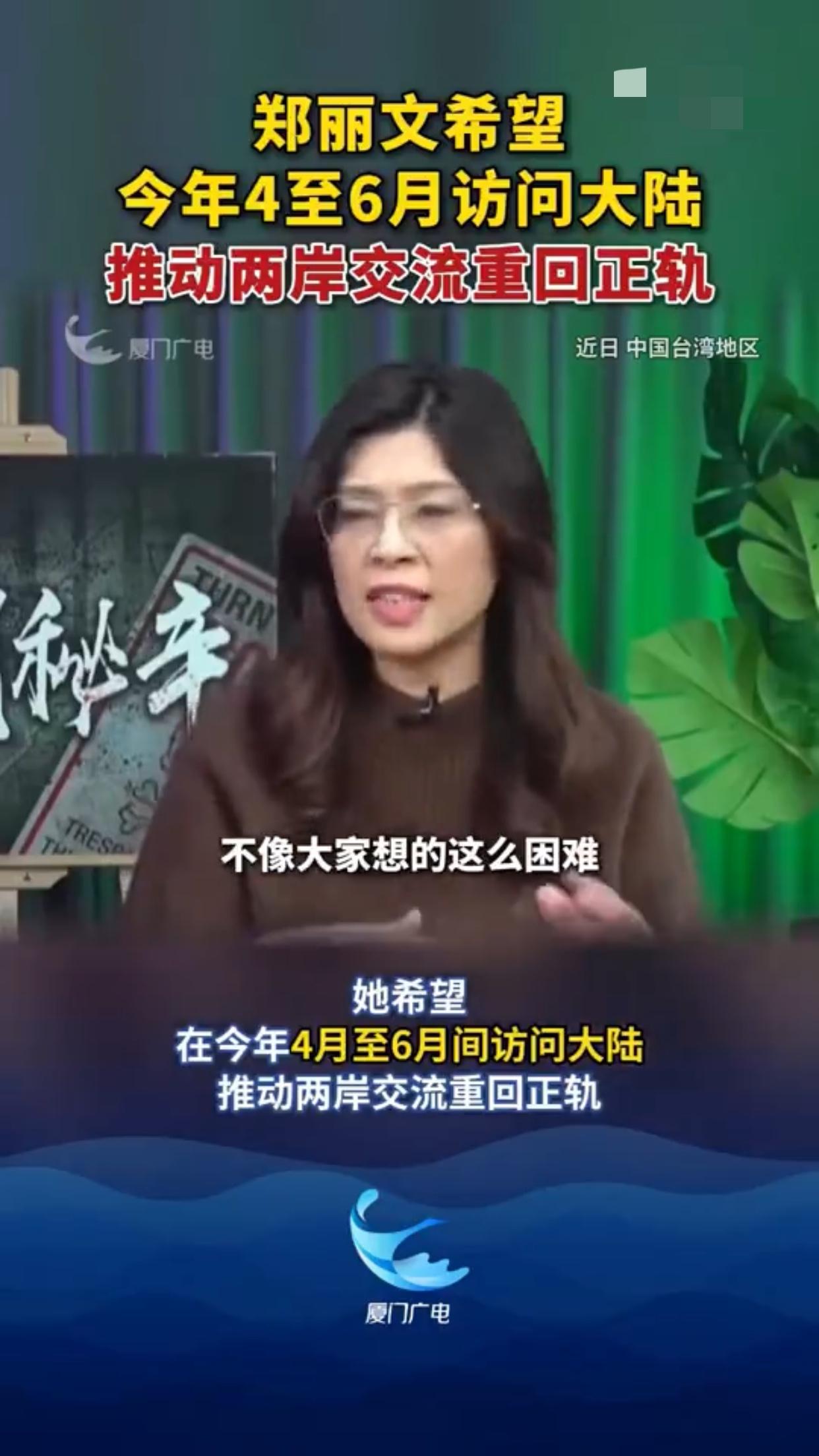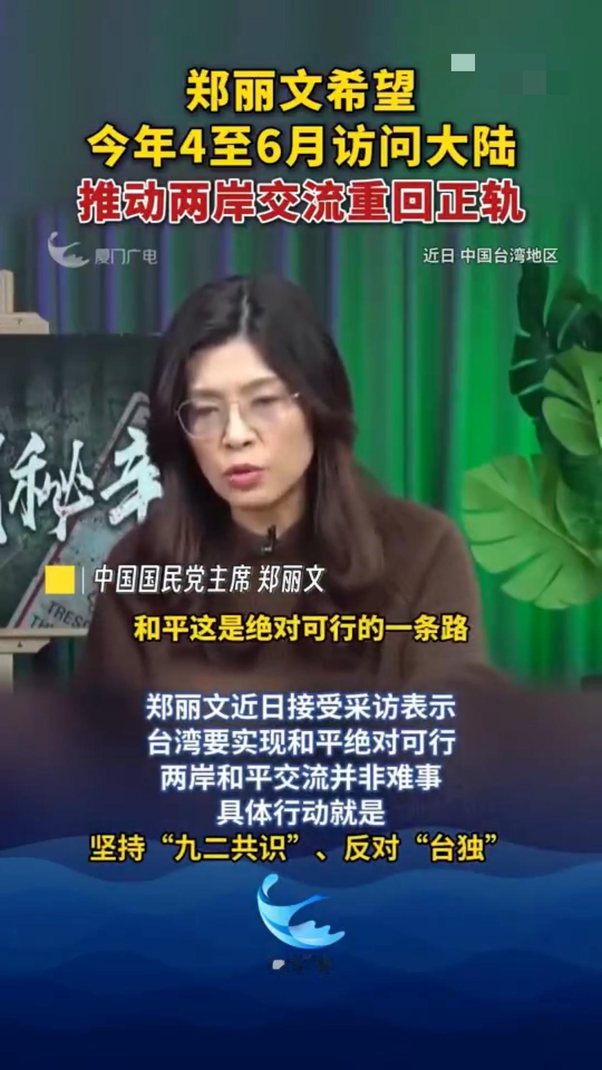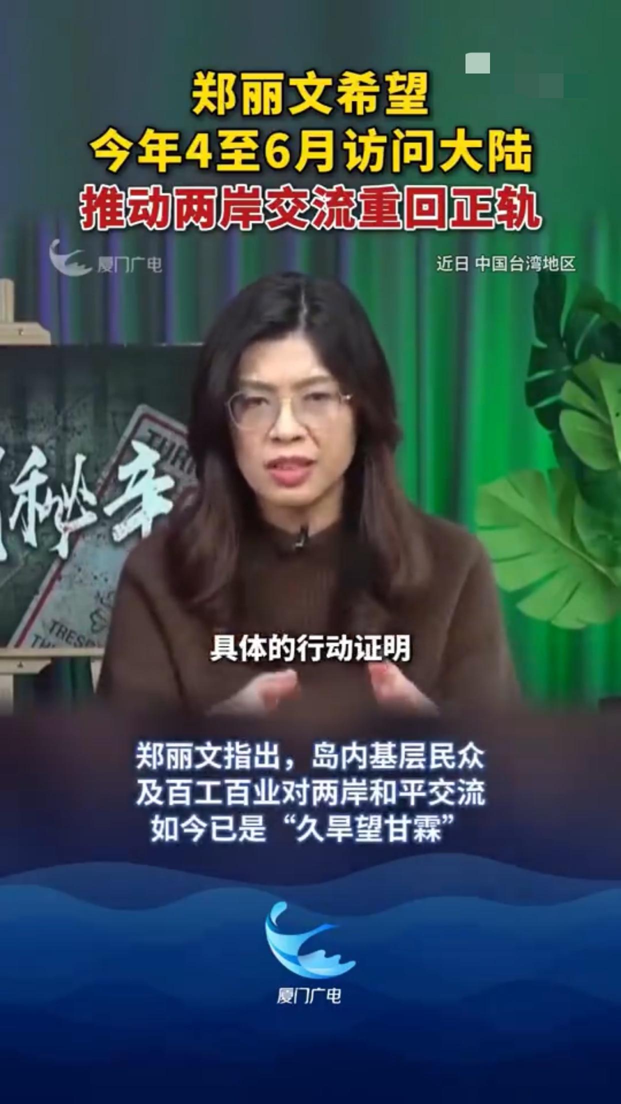 台湾国民党郑丽文希望今年4至6月能够访问大陆,她表示:“我们要证明给台湾的民众看,和平是绝对可行的一条路,因此这是为什么两岸马上进行融冰交流,不像大家想的这么困难,我们只有通过具体的行动才能来证明这一点。