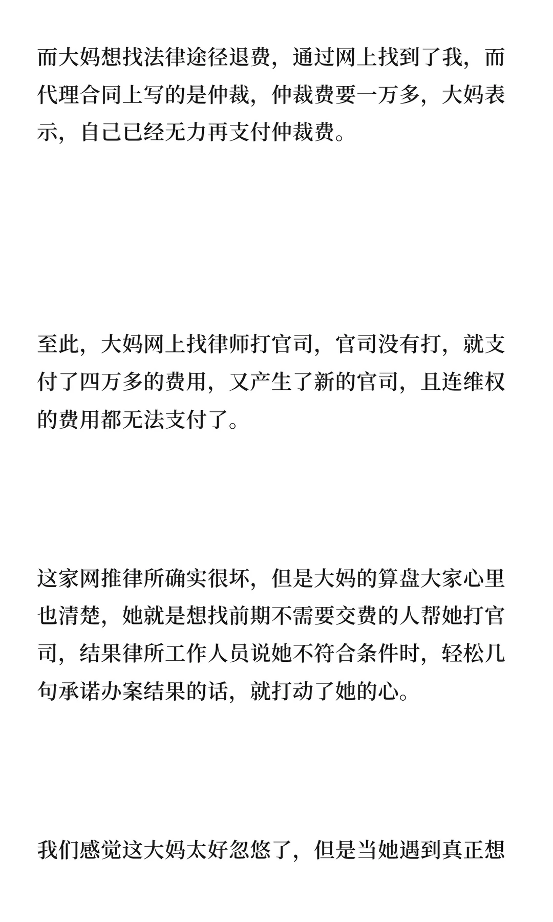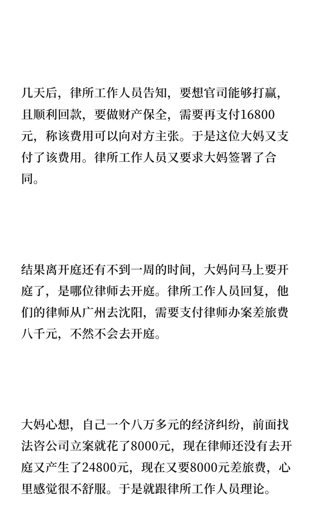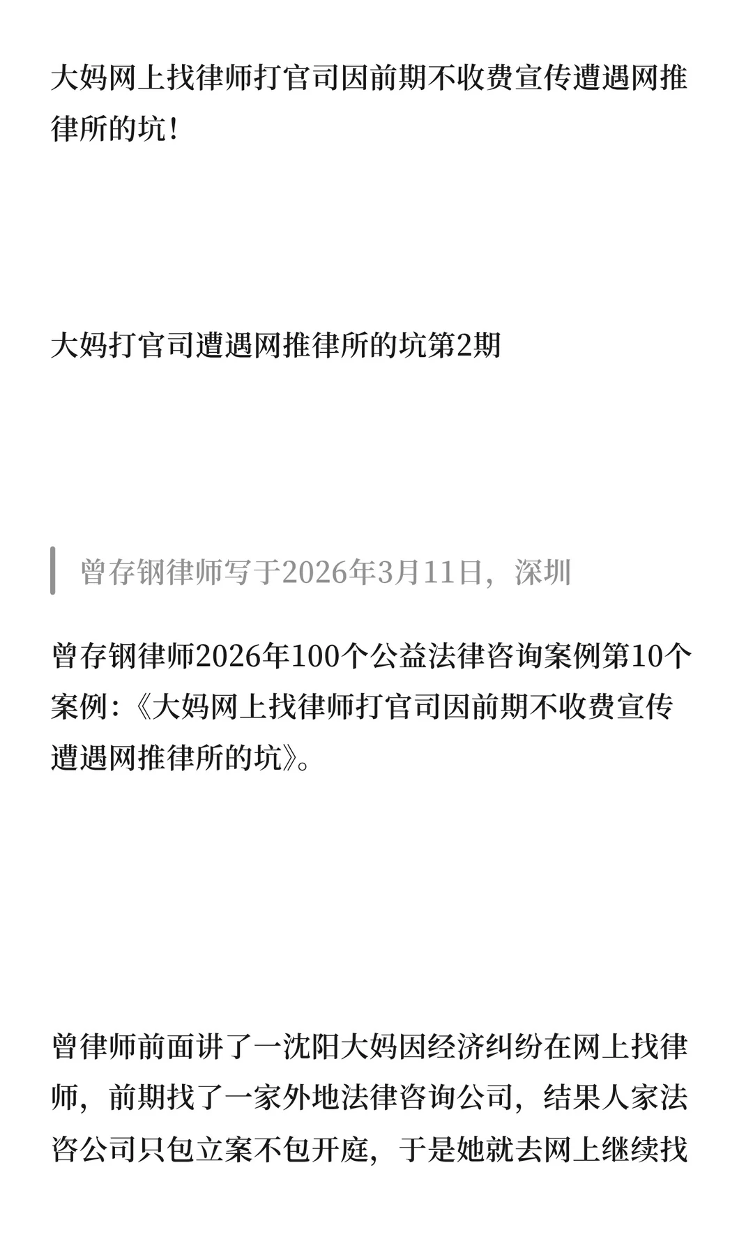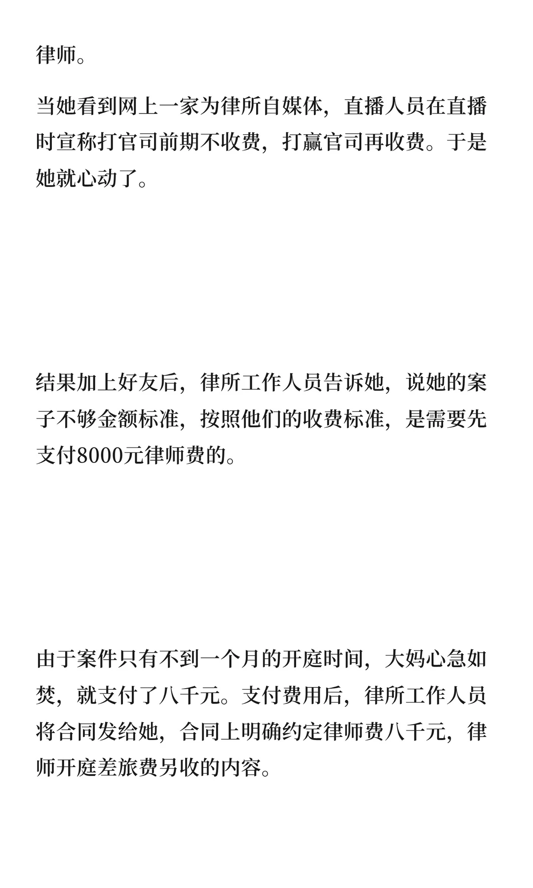 大妈网上找律师打官司因前期不收费宣传遭遇