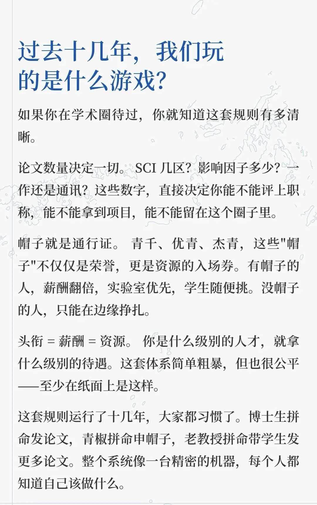 这套规则运行了十几年,大家都习惯了。博士生拼命发论文,青椒拼命申帽子,老教授拼命带学生发更多论文。整个系统像一台精密的机器,每个人都知道自己该做什么。