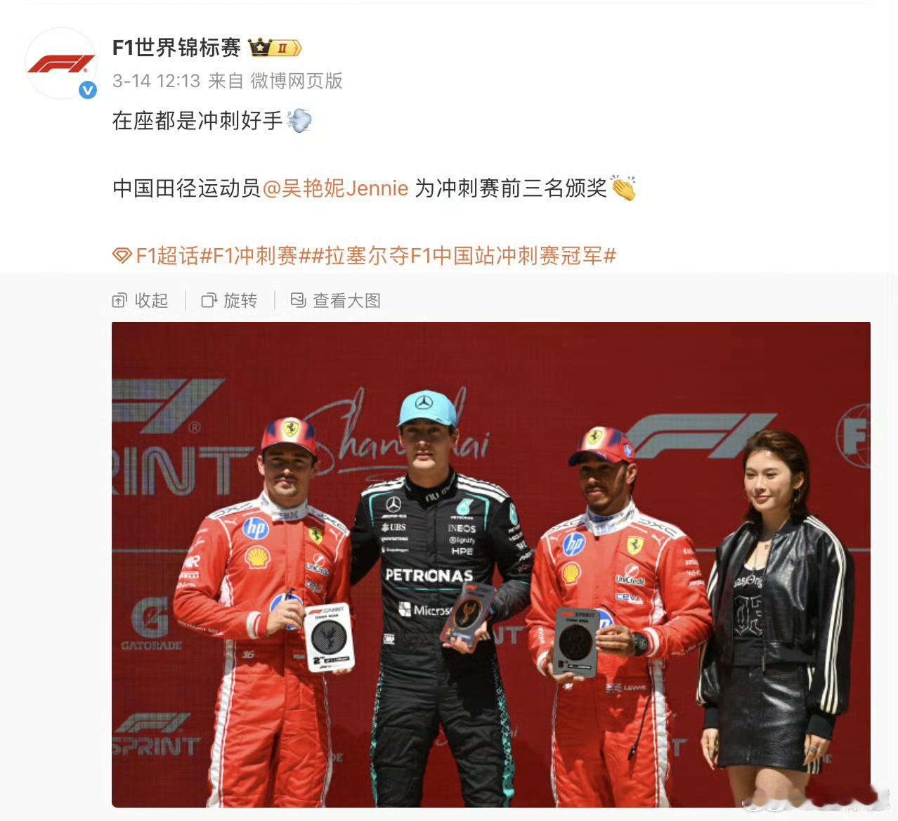 F1海外账号发合影把吴艳妮裁掉说白了还是因为咖位不够大。连奥运成绩都没有,海外谁