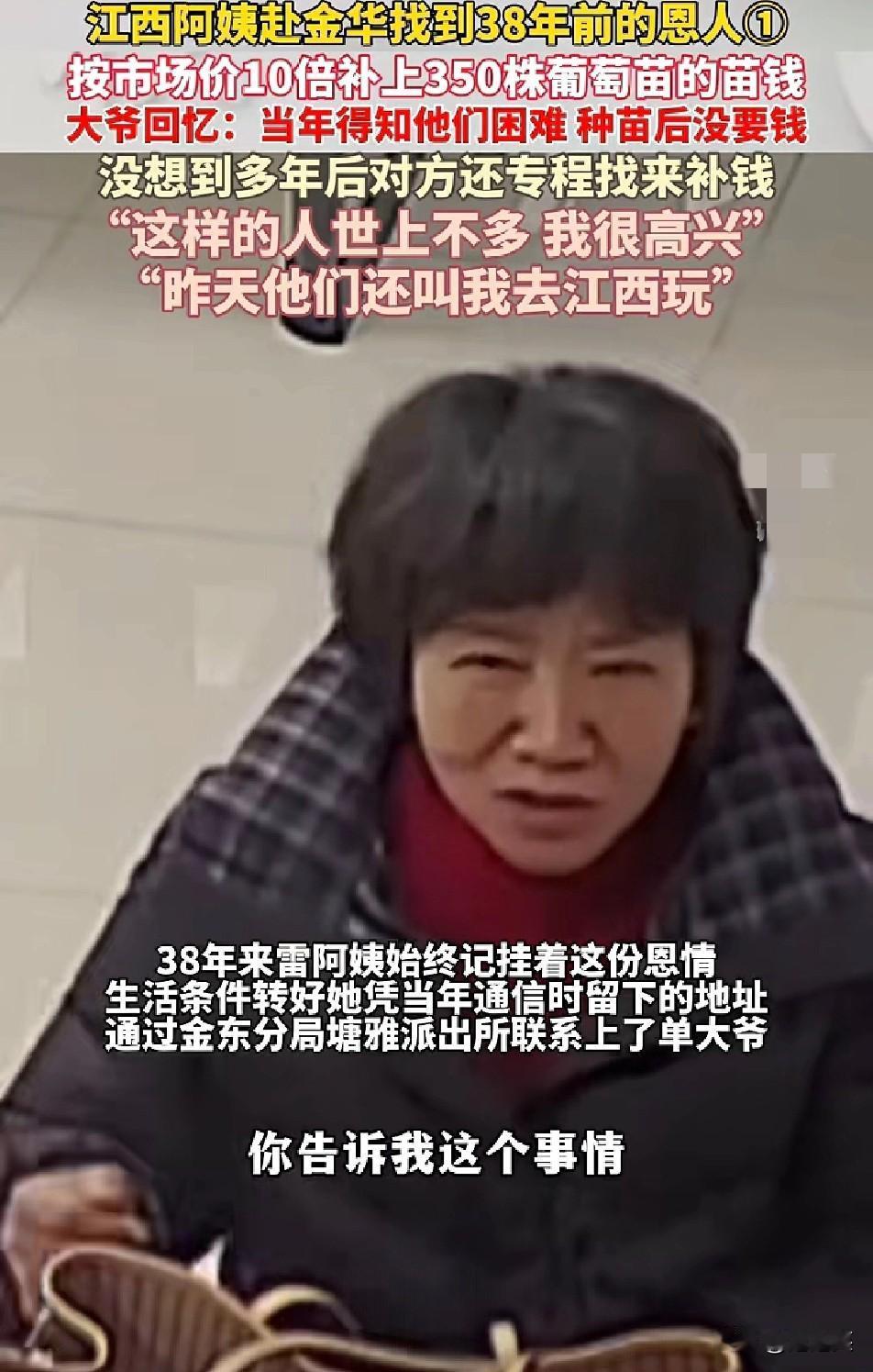 38年前 江西雷阿姨家境窘迫 浙江单大爷得知后,不仅从金华拉来350株葡萄苗送上门 还只收了点路费连苗钱都分文未取 38年后,雷阿姨凭着当年留下的旧地址 辗转找到单大爷,执意要按现在市场价的10倍补上苗钱 大爷笑着摆手当年就没想要钱,现在更不用 可阿姨说这份恩情记了半辈子必须还 如今两人成了跨地域的亲人,阿姨还热情喊大爷去江西玩 大爷说,这样重情重义的人世上不多,能遇上是福气 在这个快节奏的时代,38年的恩情还能被牢牢记住 比任何金钱都珍贵 你身边有这样让人记一辈子的好人吗 AI时代你是否感到孤独 活得通透的人,是什么样?