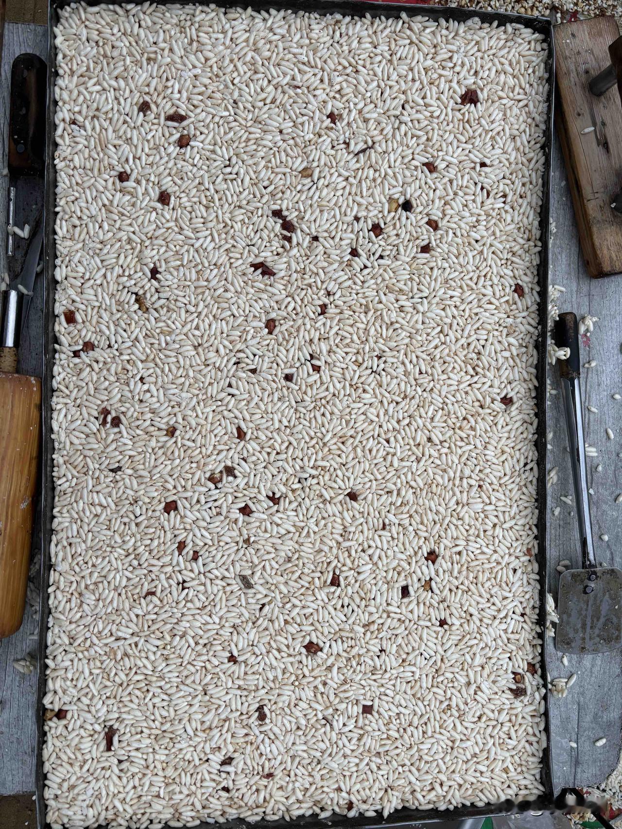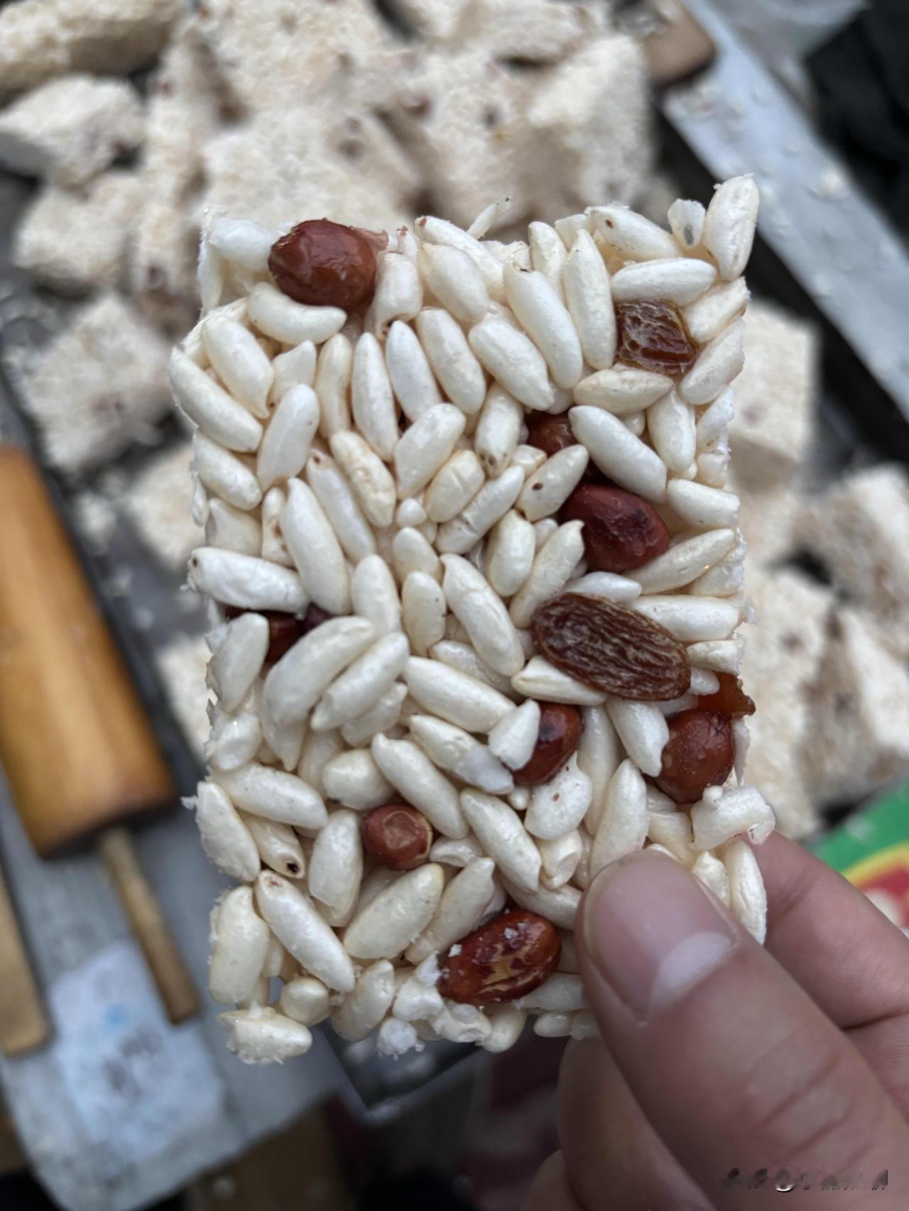 今天找了一波儿时的回忆! 今天下班快到小区的时候,看见路边有个摊子在炸爆米花。 我赶紧回家拿了点米、糖、葡萄干、花生和油去炸爆米花了。 到了后排了一会儿就轮到我了,师傅双手操作,一手摇高压炉,一手炒糖水。 等到高压炉里气温够了后,师傅大喊一声“要响了”,大家赶紧捂着耳朵,“砰”的一声,一茶缸半的大米,崩了满满一筐子。 师傅把葡萄干和花生混到糖水里,与出锅的大米一起搅拌了搅拌,然后放到模具中,再用工具给压平,就让它晾一会。 晾了一会等凝固好后,师傅拿刀给切分成小块,我拿了一块尝了尝,还是小时候的味道。 现在炸爆米花的技术也提升了,我记得小时候只能炸玉米和大米,现在连小米和薏米都能炸了。 现在很多人都没见过这种炸爆米花了吧!