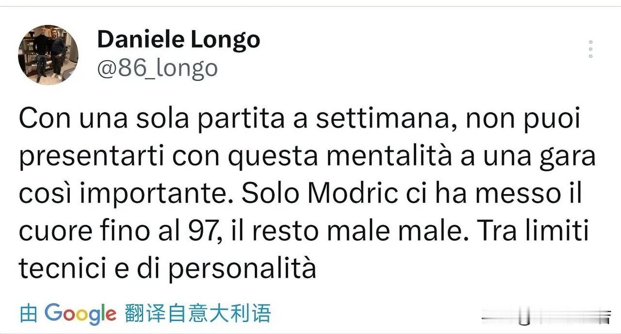 米兰跟队记者隆戈说出了很多人对比赛的心声。隆戈说米兰是一支单线作战的球队,但米兰全队看起来都没有足够的信心去赢得比赛,除了莫德里奇,他拼了九十分钟,除了莫德里奇其他人表现都是糟糕的。 说出了我想说的话,我只看到了魔笛在认真踢球,其他人都是懒散的没有进取心的在混,我内心就是觉得球员在混,但嘴上只能说球员状态低迷,但一支球队都状态低迷,说明什么?意志力和工作投入度不足,大家第一分钟就没想赢得比赛,不是混又是什么。 个人觉得一个团队的气质不是自下而上的,而是自上而下的。个人觉得米兰目标有问题,赛季初你就看到头了,赛季二十轮就告诉你这赛季完成目标了,那就都一样了,阿莱格里的保住前四不是谦虚,而是真实的想法,所以球队低迷和主教练缺乏进取心有很大关系。