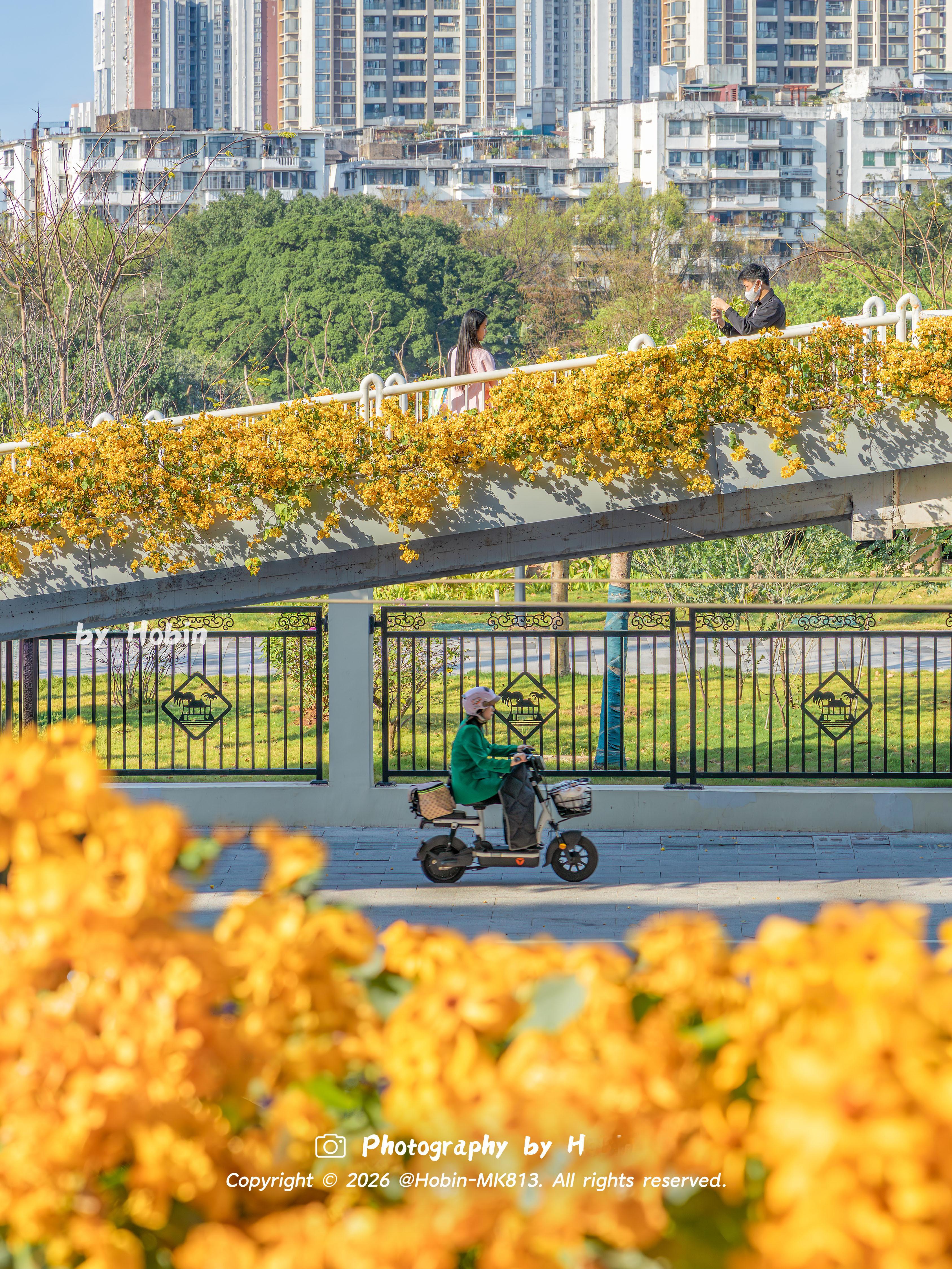 广州惊现春日金色瀑布💛盛放的金黄色三角梅缀满天桥,簇簇金灿灿的花团如瀑布般倾泻