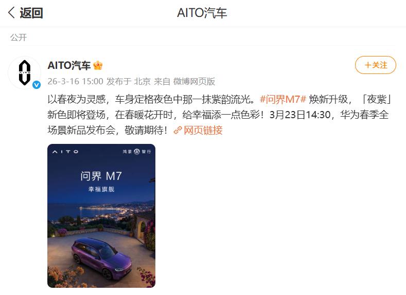 告别黑白灰,问界M7夜紫凭什么未发先火? 3月16日,问界M7官宣将推出夜紫新色,直接点燃了话题引线。在满大街都是黑白灰的今天,鸿蒙智行这一手玩得漂亮。紫色,向来是高贵与神秘的代名词,而夜紫这个命名,更是多了几分深邃的质感。虽然还没到能亲眼目睹实车的时候,但就冲这张官图透露出的氛围感,已经足够让颜控们蠢蠢欲动了。有人说,这颜色是为那些不想随波逐流、又追求低调高级感的人准备的。它不张扬,但绝对有辨识度。它很经典,却又带着一丝新潮。 能把一个新车色做成车圈的热点话题,问界M7这次确实拿捏住了大家的期待。3月23日发布会越来越近,实车到底有多能打?这层神秘的面纱,就留到那天去揭晓吧。反正,这份紫定好看,我先期待住了!问界M7官宣夜紫新色