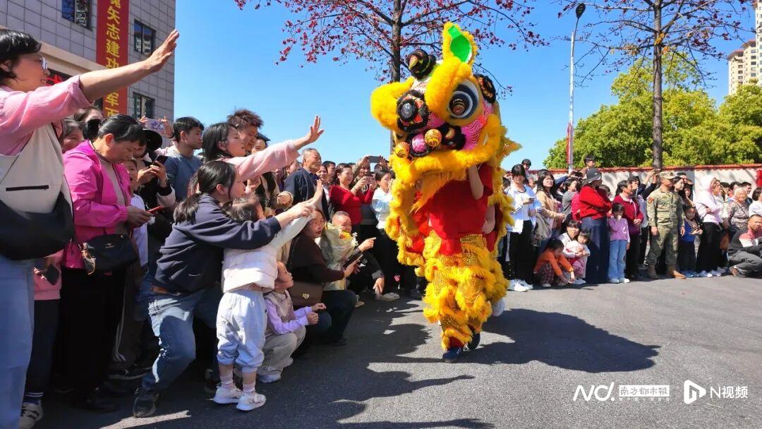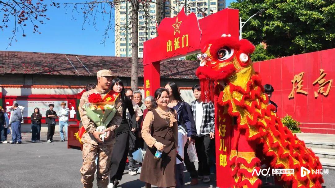 欢送仪式现场,锣鼓喧天,醒狮助威,处处洋溢着喜庆而庄重的氛围。