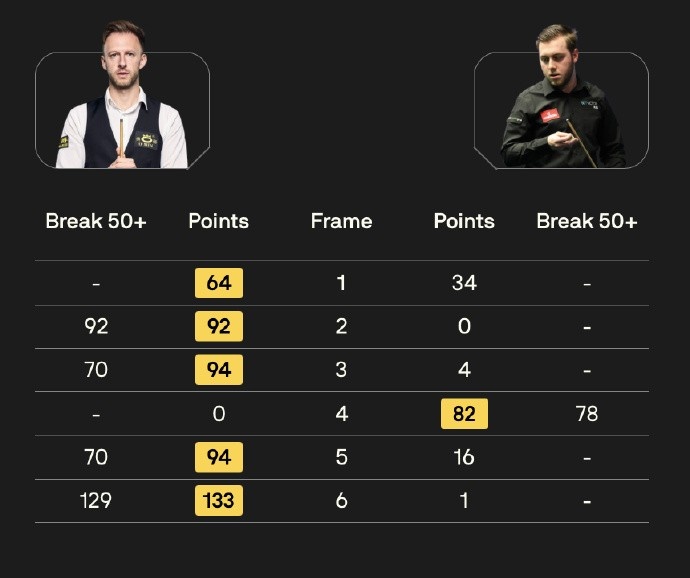 全场比赛,贾德·特鲁姆普打出一杆129分和三杆50+(92、70、70),马克·劳埃德在第四局打出单杆78分。