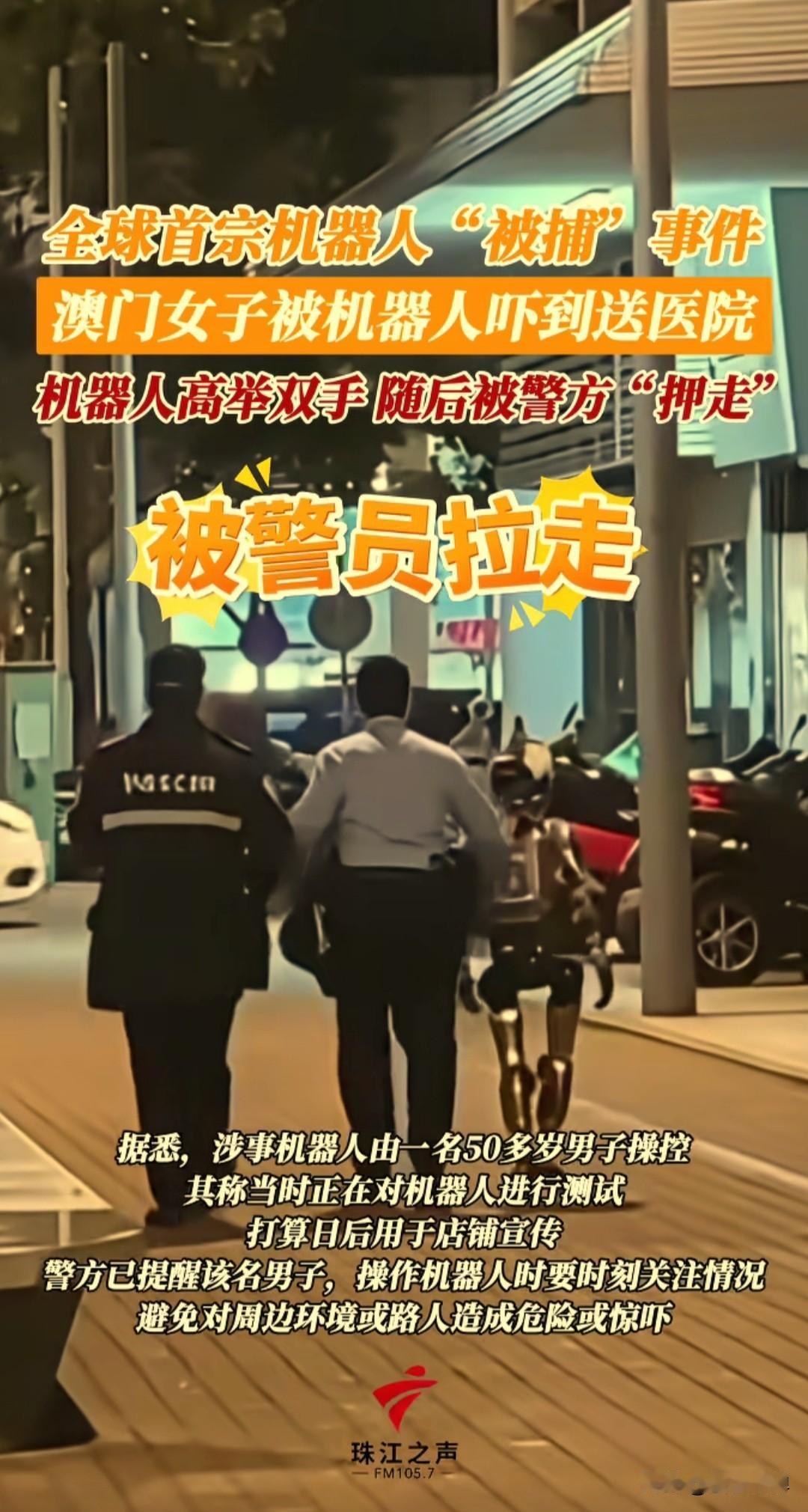 离谱!机器人闯祸了,女子被机器人吓进医院,机器人还被“押走”?真相笑死人 谁能想到,机器人也能“犯事”被带走?近日澳门沙梨头南街,一场“人机冲突”闹得沸沸扬扬,还被网友戏称“全球首宗机器人被捕事件”。 事发时,一名女子正走在街头打电话,身后突然出现一台金属质感的人形机器人,毫无征兆地靠近。女子被吓得当场情绪崩溃,对着机器人大声斥责,而机器人竟乖乖举起双手,做出“投降”姿态,这一幕被路人拍下后迅速发酵。 女子也因为被惊吓去了医院,经过检查后无大碍也没有投诉,更戏剧性的是,有治安警员赶到现场,将机器人“押送”着离开,不少人以为机器人真被“逮捕”了。 网友说:“被阿姨骂的时候突然举手投降,看起来很可爱了,最后被带走的那一段走路,很像一个无辜的孩子。” 据悉:涉事机器人是宇树G1人形机器人,属于一家教育中心的,由一名50多岁男子操控,当时正在做宣传活动。 这名女子被吓后送医检查,万幸身体没大碍,后面也没追究责任,而所谓“押走”,其实是警员怕机器人再吓到路人,把它护送回了所属店铺,根本不是执法抓捕。 警方已经提醒操控者:以后在公共场所操作机器人,必须时刻盯着周围,不能再吓着别人了。 这件事给所有人提了个醒: 公共场所不是机器人“测试场”,金属外壳、突然动作很容易吓到路人,测试得做好警示和防护! “机器人被捕”就是个误会,它可没犯罪能力,真出事得找操控者负责。 智能设备进生活,不能只图酷炫,得考虑普通人的安全感,不然净闹笑话。 这下好了,这台机器人怕是要成“网红”了,以后出门测试估计得挂个“我很乖,别害怕”的牌子吧!