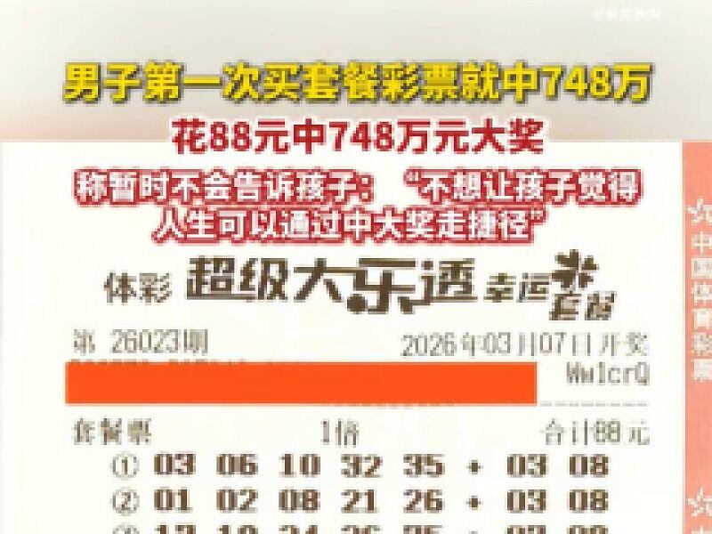 浙江吴先生花88元买彩票中了748万元,这运气简直逆天!3月7日体彩超级大乐透开奖,他就这么偶然路过彩票店,花88元买了人生第一张套餐彩票,就中了头奖。这张彩票可太牛了,除了一等奖,还有2注二等奖、5注三等奖和10注四等奖。 不过吴先生特别理智,他有俩孩子,其中一个上初中,正是价值观形成的时候。他不想让孩子觉得中大奖是人生捷径,决定先不告诉孩子,悄悄把幸运藏心底。他打算用这笔钱改善家庭生活,为孩子未来教育和成长做长远打算。这决定太赞了,给孩子树立了好榜样。