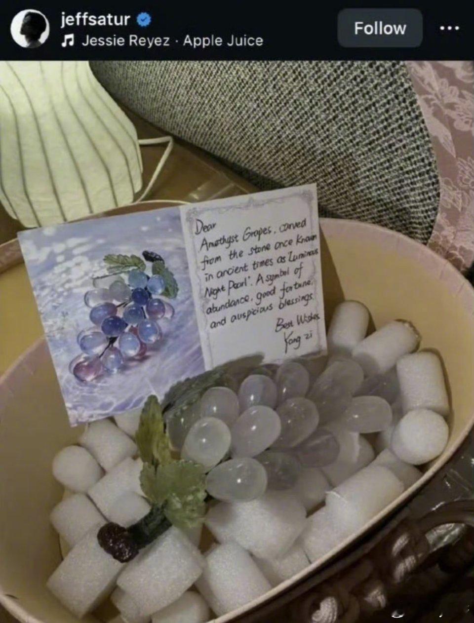 杨紫送给罗杰夫紫玉葡萄杨紫为罗杰夫手写英文礼物卡杨紫走到哪里都能交到新朋友和