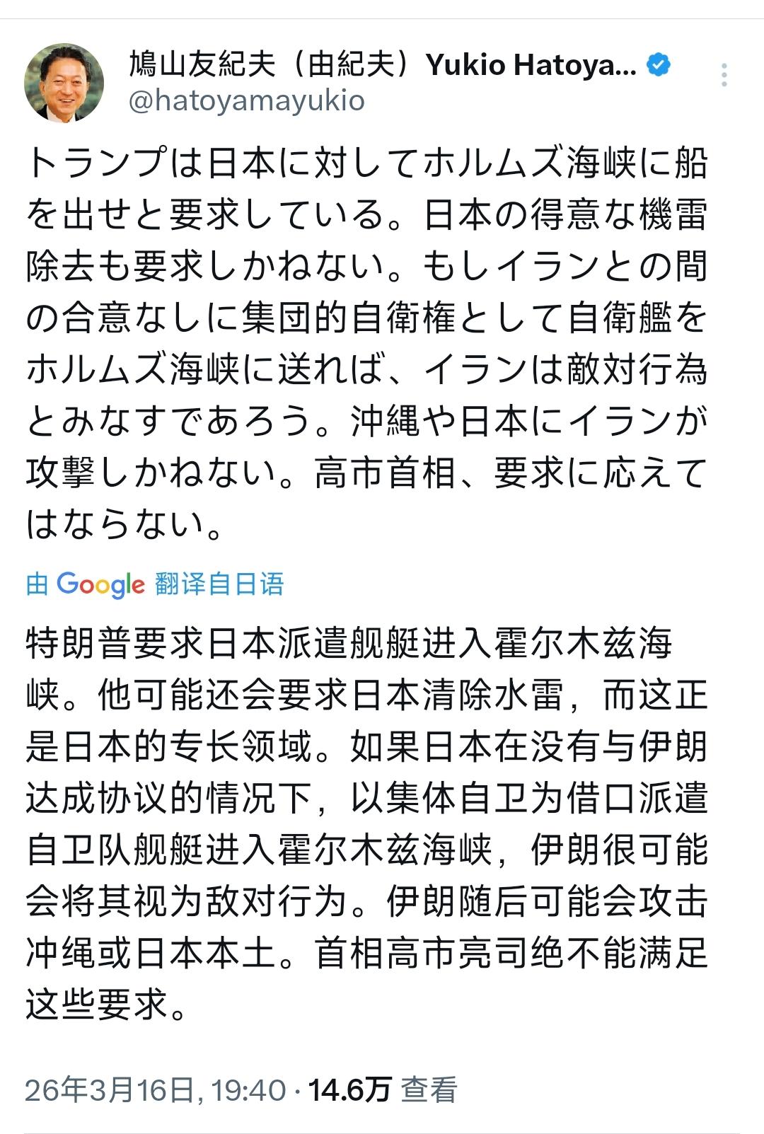 日本前首相鸠山由纪夫今晚(3月16日晚)写道:“特朗普要求日本派遣舰艇进入霍尔木兹海峡。他可能还会要求日本清除水雷,而这正是日本的专长领域。如果日本在没有与伊朗达成协议的情况下,以集体自卫为借口派遣自卫队舰艇进入霍尔木兹海峡,伊朗很可能会将其视为敌对行为。伊朗随后可能会攻击冲绳或日本本土。高市首相绝不能满足这些要求。” [机智]评几句:如果日本盲目屈从特朗普的要求,日本只会沦为伊朗的打击目标。尽管伊朗向琉球乃至日本本土发射导弹的可能性很低,但是如果高市早苗一味追随美国,借集体自卫之名派舰赴霍尔木兹海峡,甚至替美国清除水雷,必然被伊朗视作敌对行为。届时,日本的能源命脉与本土安全都将直面风险。鸠山由纪夫的警告字字戳中要害,可高市早苗却在对美谄媚中丧失理智,明知这是美国抛来的“自杀式命题”,仍然执意将日本绑上美国以色列的战车。这般拎不清的外交,不过是沦为美国地缘博弈的炮灰罢了。