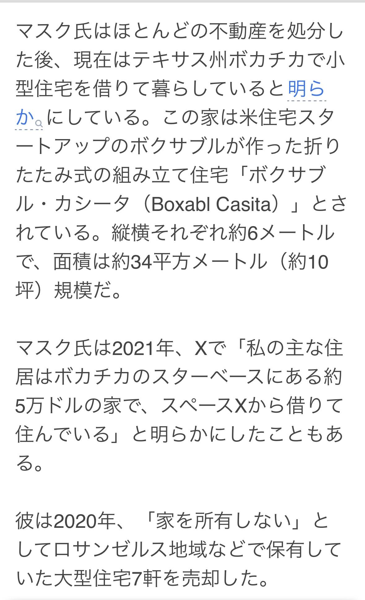 马斯克的住宅内部照片曝光,引发热议。这栋造价约5万美元的小型预制房屋,面积约34平方米。 住宅采用开放式布局,屋内只有白色橱柜、冰箱、燃气灶和水槽,墙上没有任何装饰。客厅中央的桌上摆放着一个SpaceX火箭模型和几本书。冰箱里几乎没有食物,浴室里也只有一条毛巾。 2021年,马斯克还在SpaceX上透露:我的主要住所是位于博卡奇卡星际基地的一栋价值5万美元的房子,我从SpaceX租的。 2020年,他出售了位于洛杉矶地区及其他地区的七处大型房产,并声称自己“没有房产”。