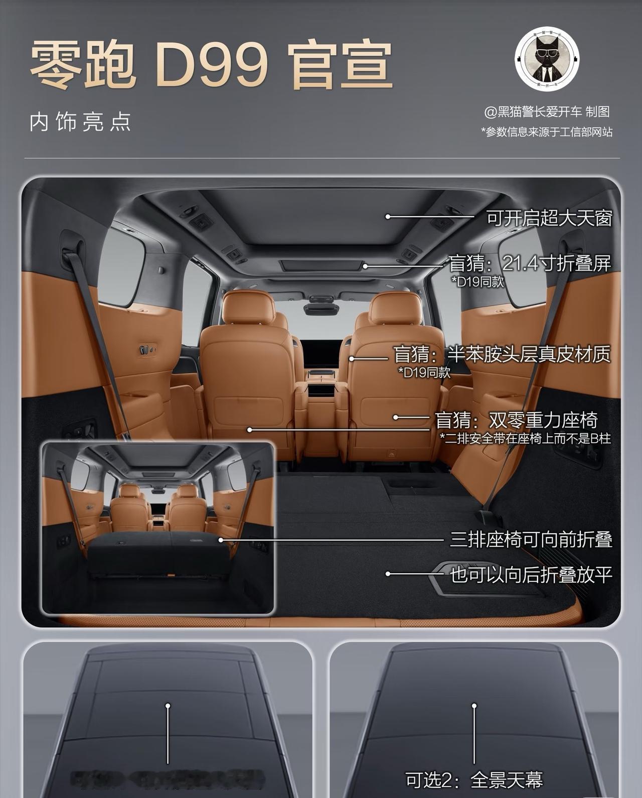 零跑首款MPV D99的申报图出来了!尺寸够大,轴距3110mm,有纯电和增程两种动力。能选投影大灯、交互灯幕,第三排能折,空间灵活。定位豪华MPV,30万级定价,感觉有点东西~