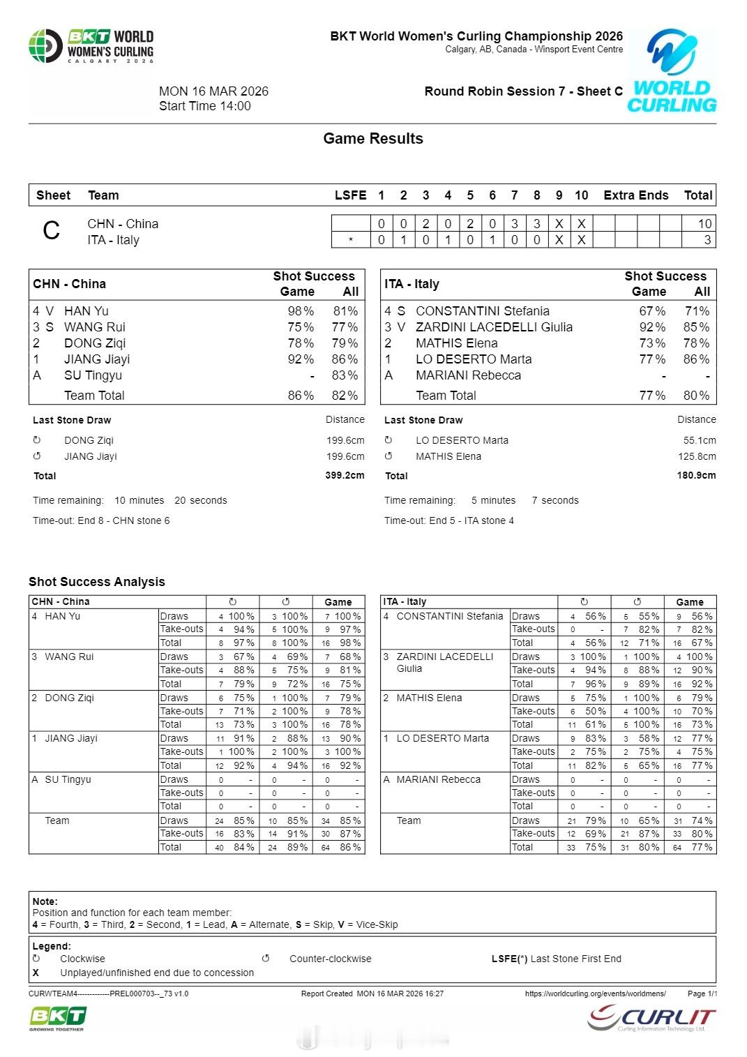 【女子冰壶世锦赛中国10-3大胜意大利 取得第二胜】2026年女子冰壶世锦赛 3月16日卡尔加里,女子冰壶世锦赛循环赛再战一轮,中国队10-3提前两局逼迫意大利投下降书,取得第二场胜利。中国队目前以2胜3负暂列第八,黑马土耳其四战全胜与东道主加拿大并列榜首。北京时间18日凌晨4时,中国队将迎战1胜3负的美国。