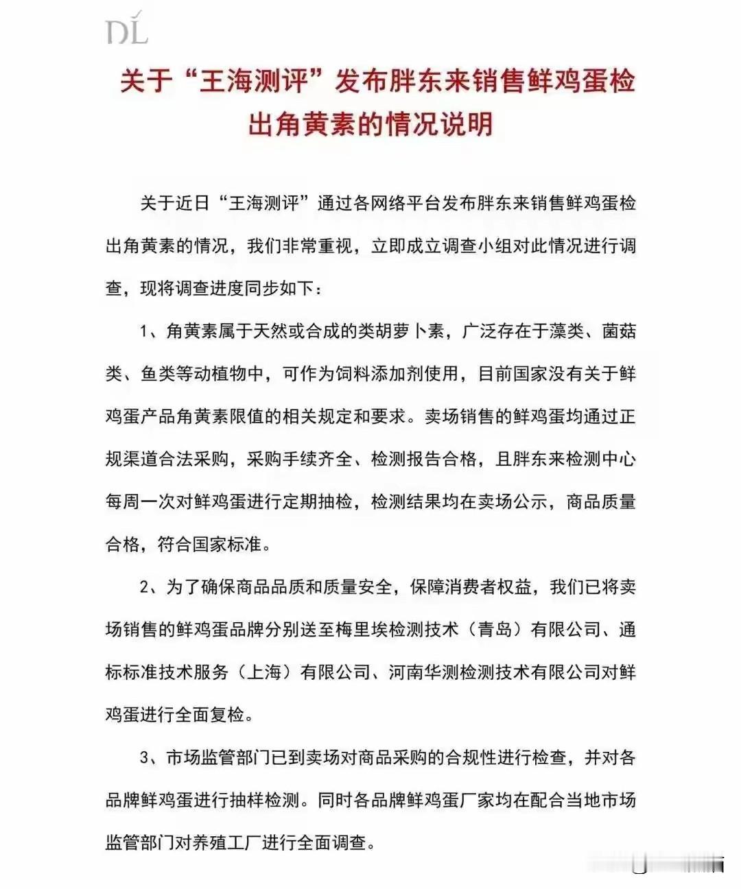 这次可能碰到硬茬了! 3月13日,知名打假人王海团队公开爆料称 胖东来的十款鸡蛋均检出人工角黄素,可能涉嫌虚假宣传。 而随后在3月15日,胖东来发文回应了王海的言论,鸡蛋已经送到第三方复检,如果有问题会下架整改,该赔钱的赔钱,该补偿的补偿,但如果没有问题,胖东来将会拿起法律武器,追究抹黑造谣者的责任。 大家都知道在去年红内裤事件中,胖东来把某博主告上法庭,最终该博主被判赔偿胖东来40万,并道歉30天。 现在鸡蛋有没有问题不好说,必须等到检测报告出来之后,如果王海说的是对的,依照胖东来的风格肯定会得到一笔奖励,但如果有所差错,可能将会赔偿一笔,大家静等结果吧!