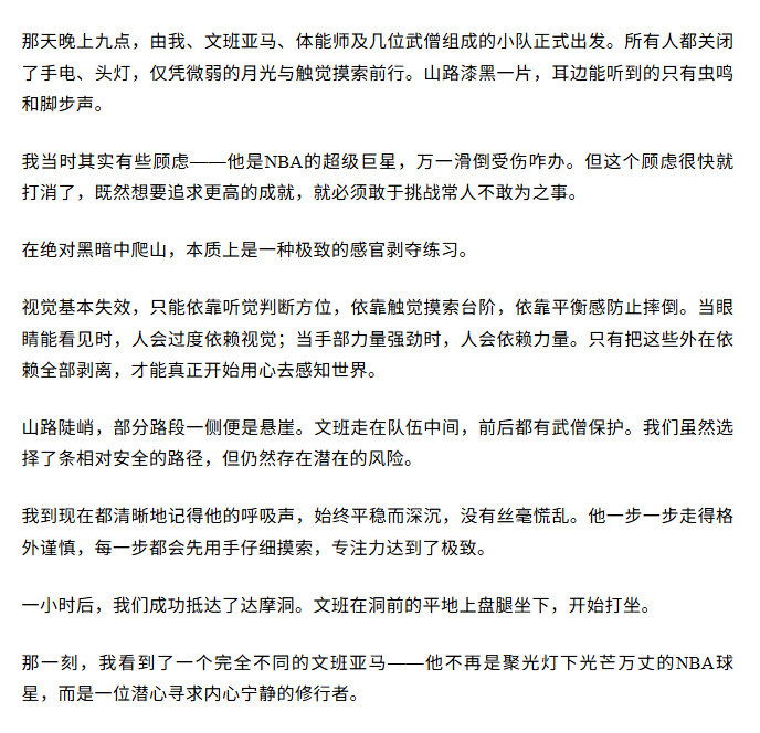 而为了提升对球场局势、对手和队友位置的瞬间感知与预判,延安师傅安排文班夜爬达摩洞,追求不过度依赖视觉力量来感知世界。
